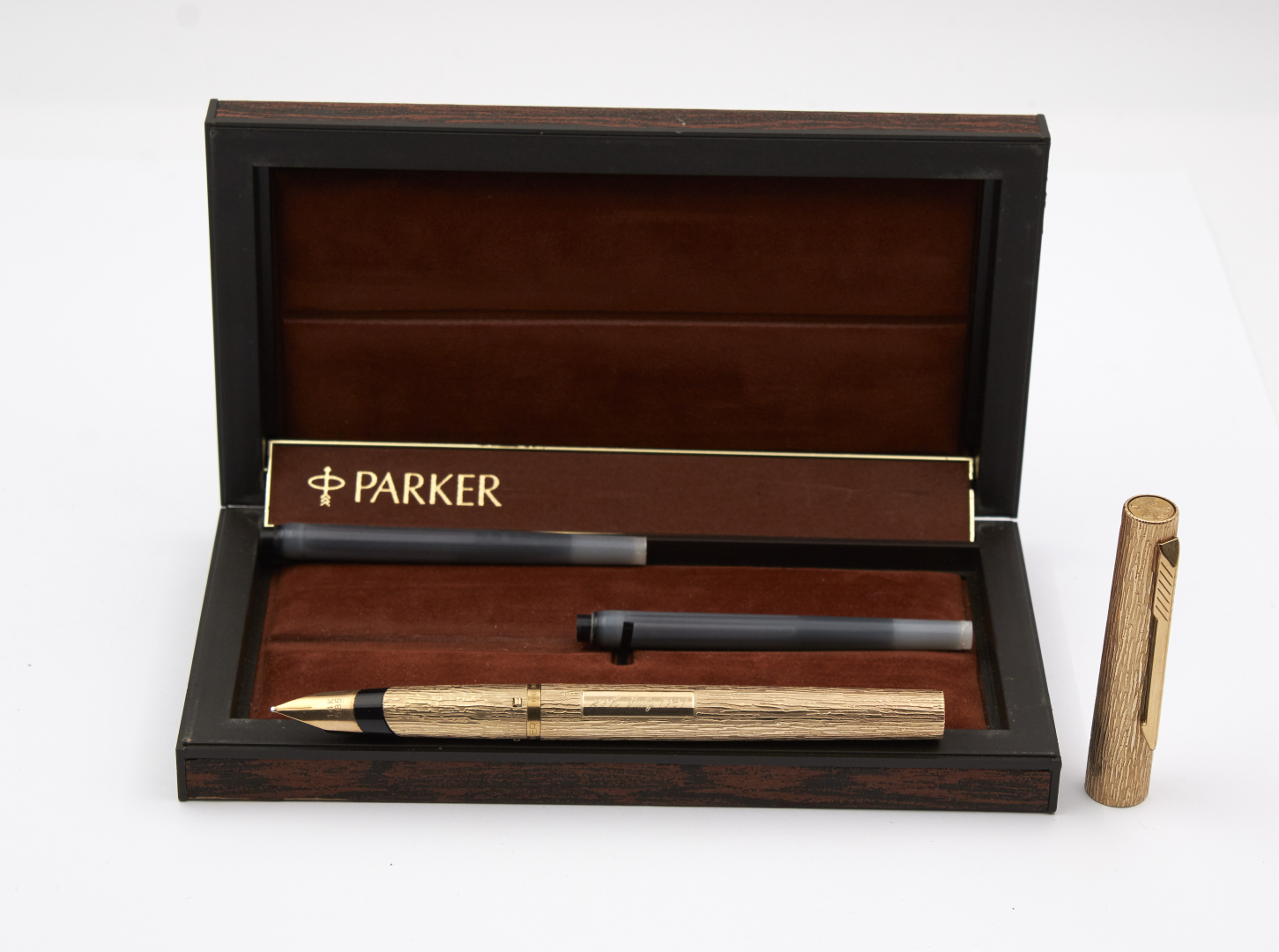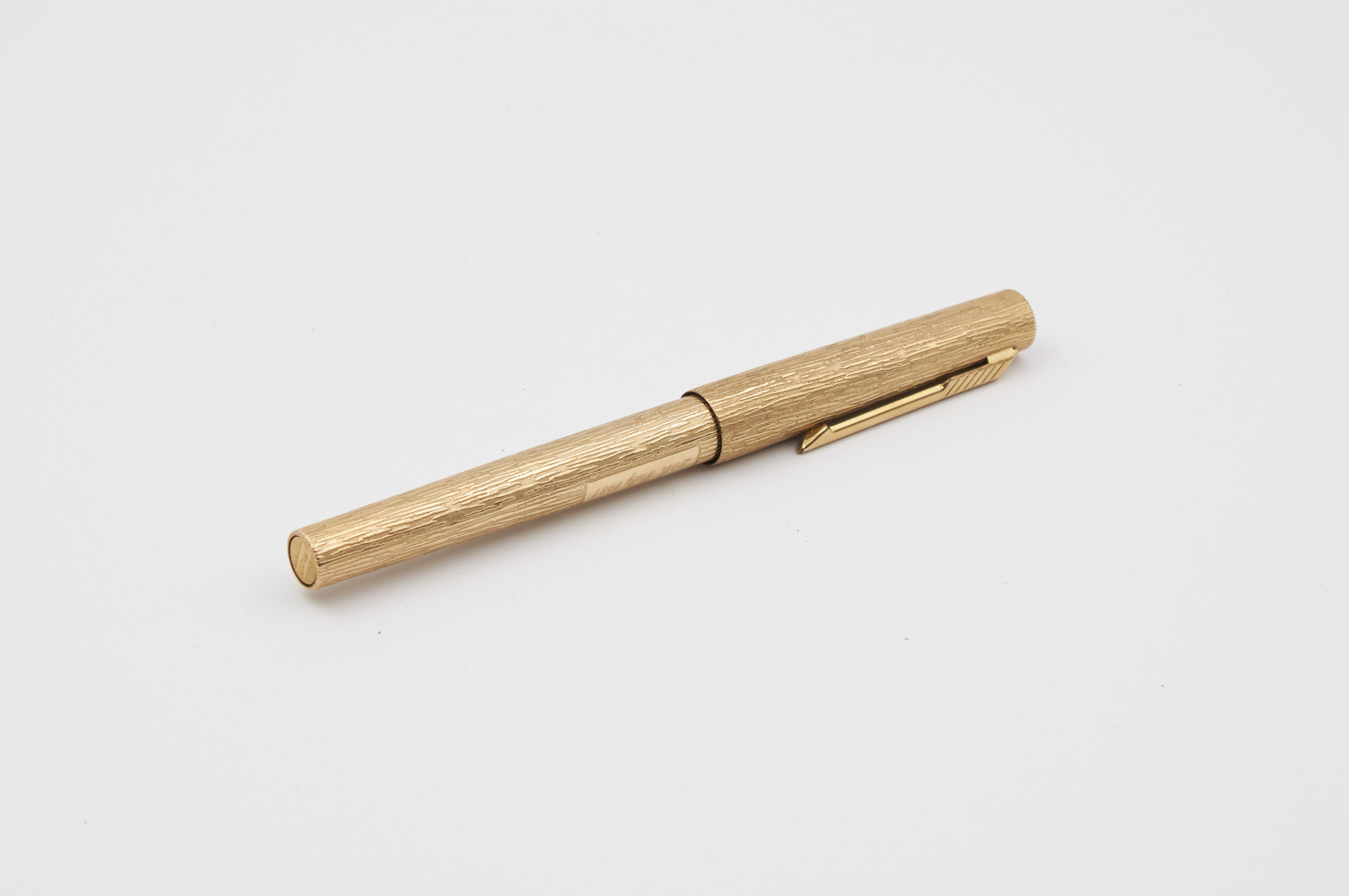 N. 0822, 14K gold signed nib, B size, ink cartridges, cap with Scottish Prince emblem, engraved with the date July 29, 1981, gold-plated with bark pattern.