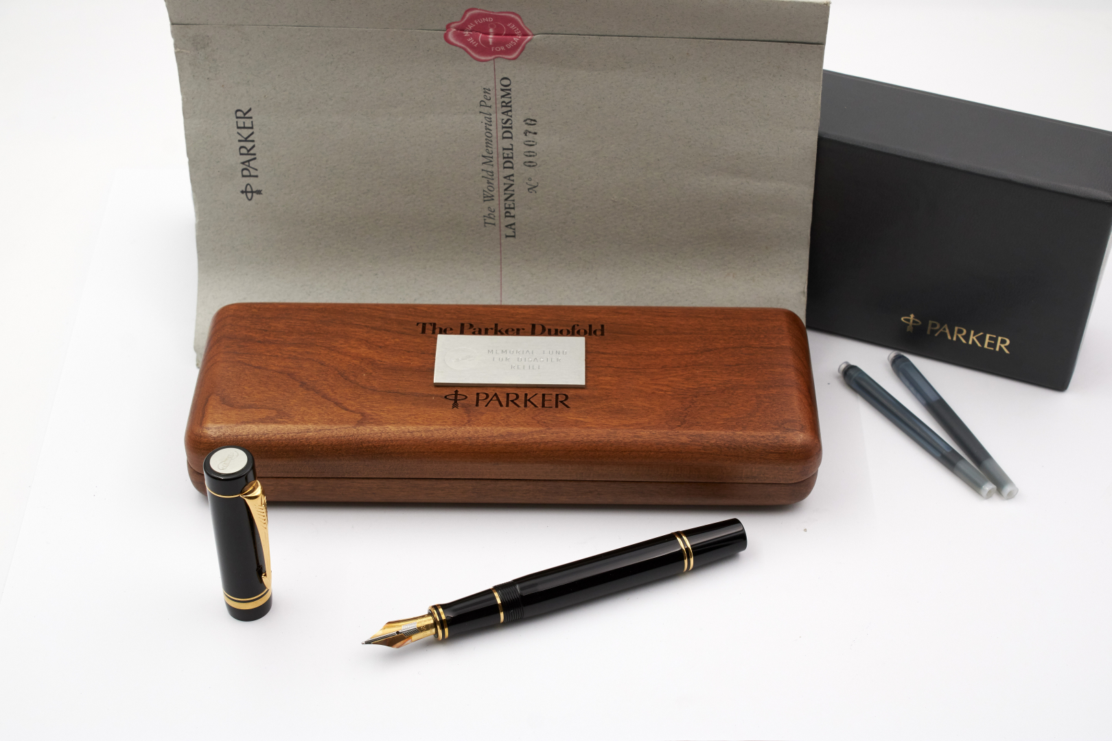 PARKER DUOFOLD FOUNTAIN PEN "MEMORIAL FUND FOR DISASTER RELIEF", BOX AND GUARANTEE