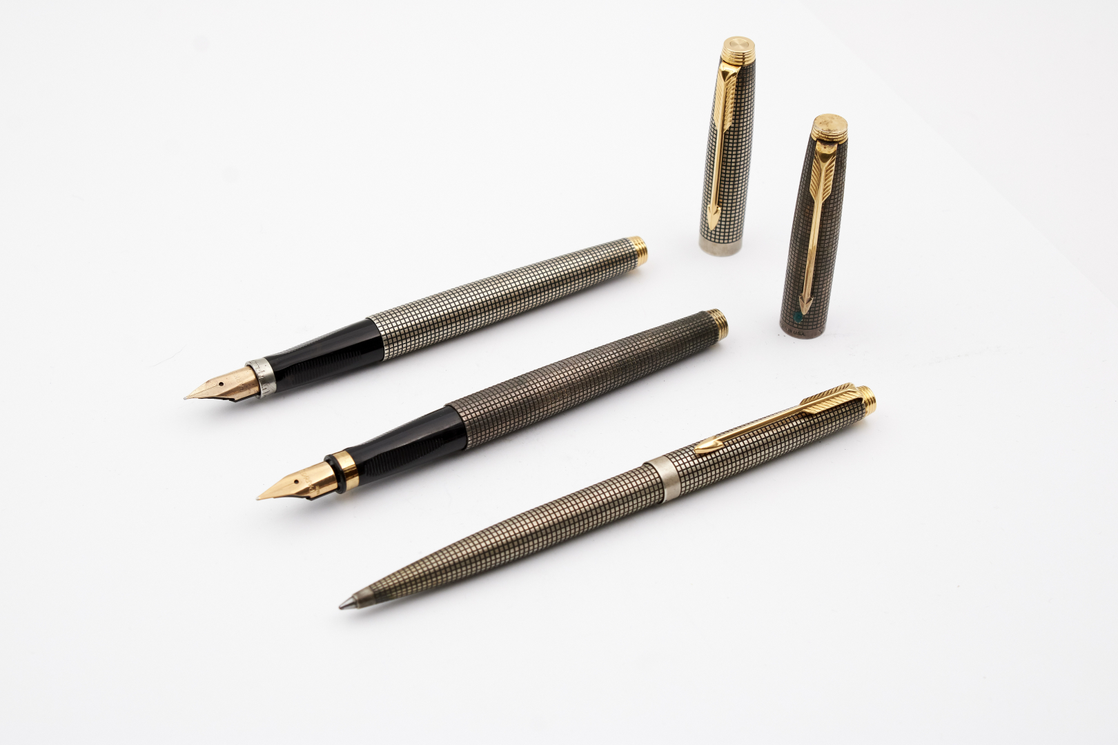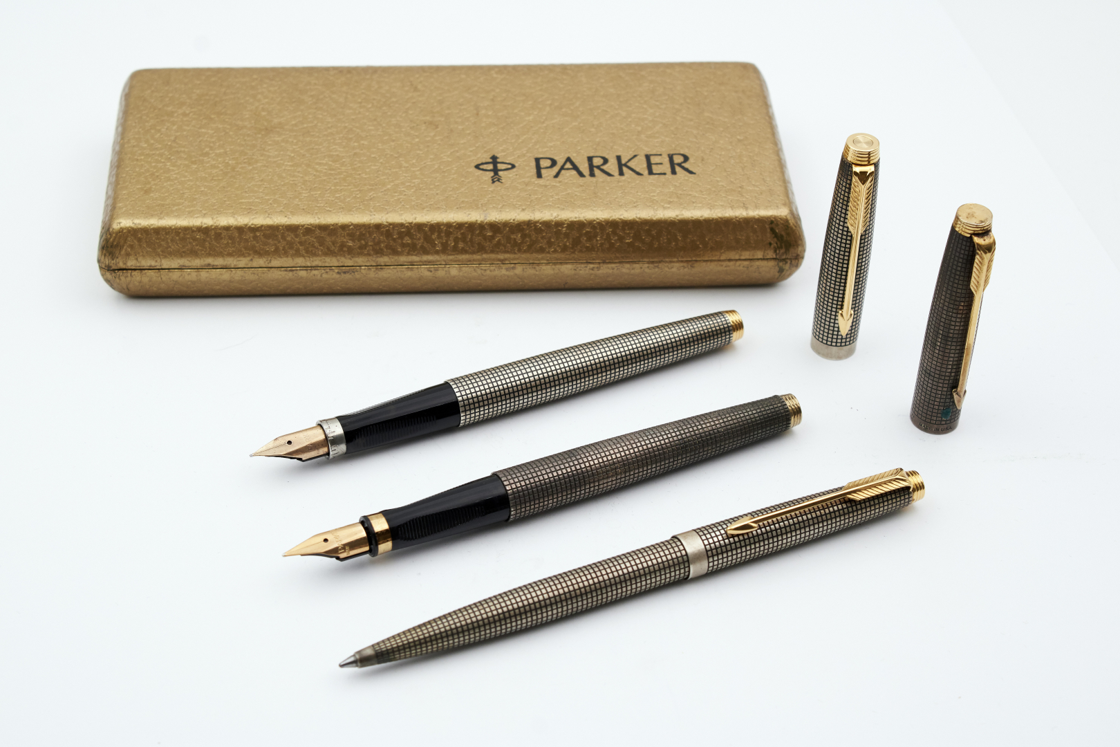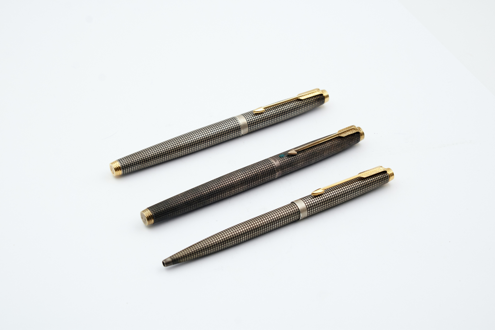 PARKER 75 CISELÉ LOT OF TWO FOUNTAIN PENS AND ONE BALLPOINT PEN