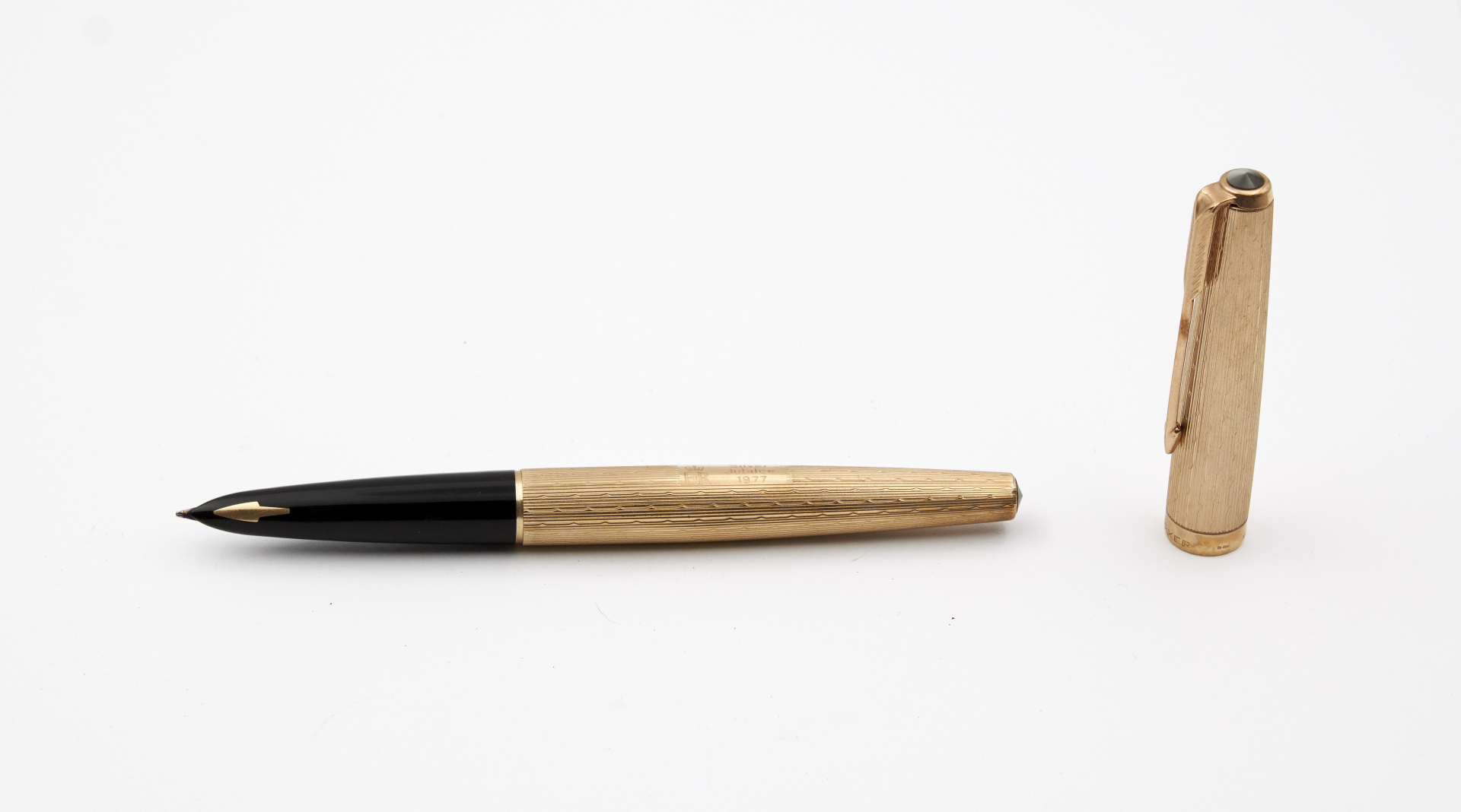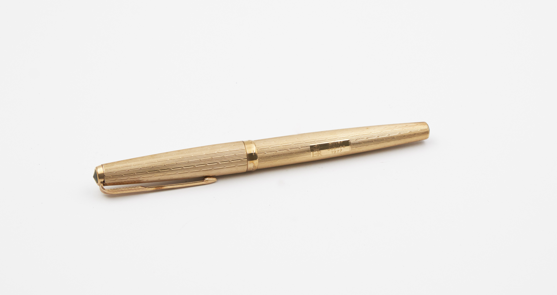 In 9K gold, hallmarked, signed PP, engine turned, engraved with dedication "ER (surmounted by crown) Silver Jubilee 1977", hooded nib, converter filling.