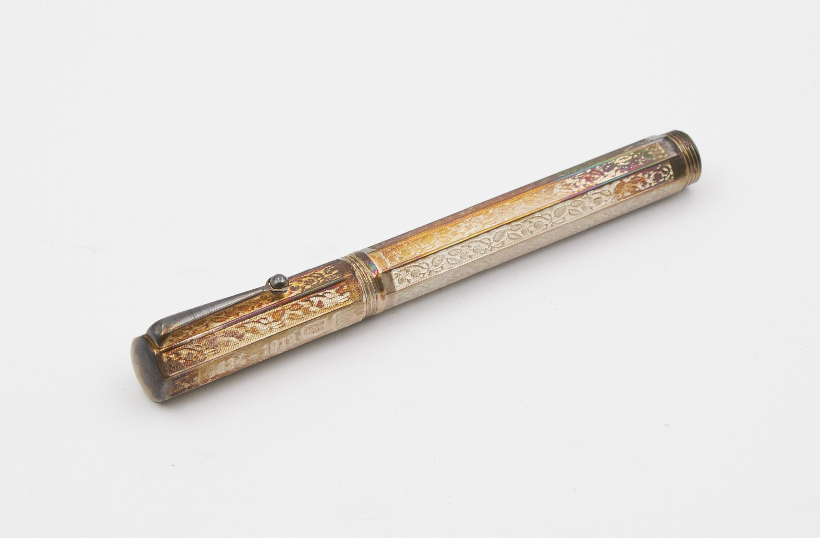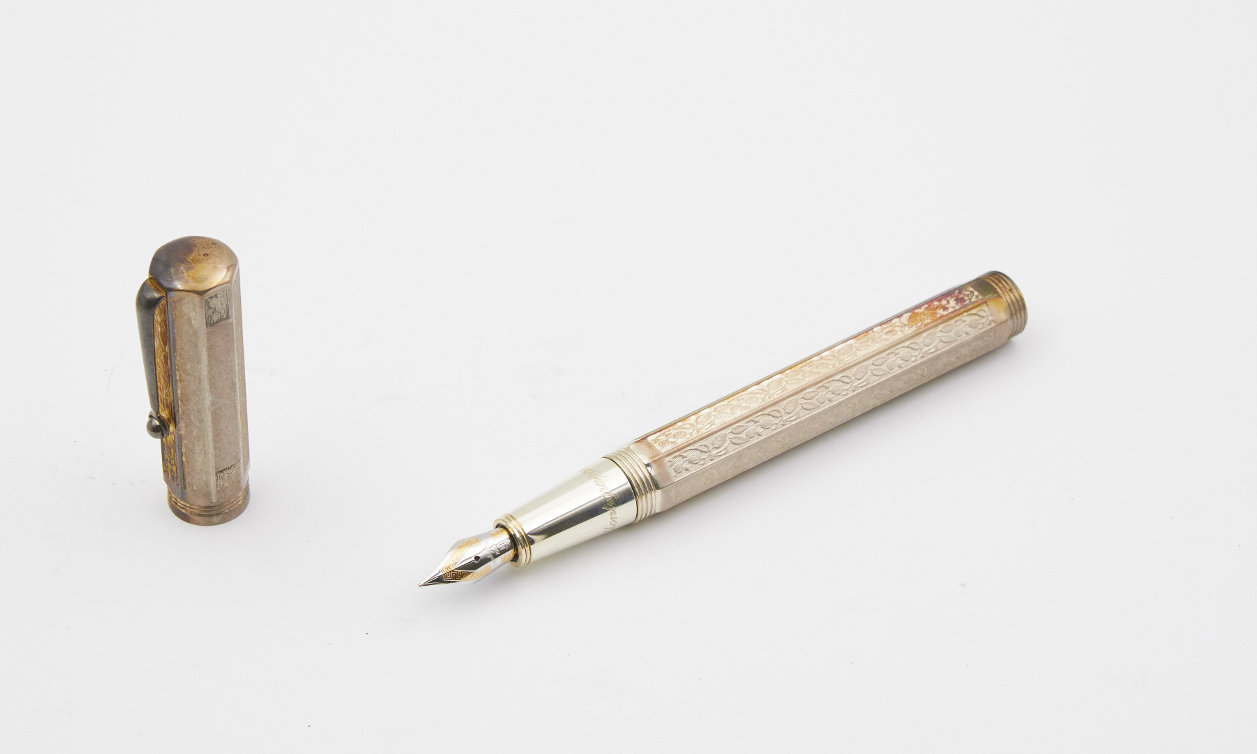 N. 0643/1912, signed 18K gold nib, size M, ink cartridges, polygonal body in 925 silver with leaf decorations.