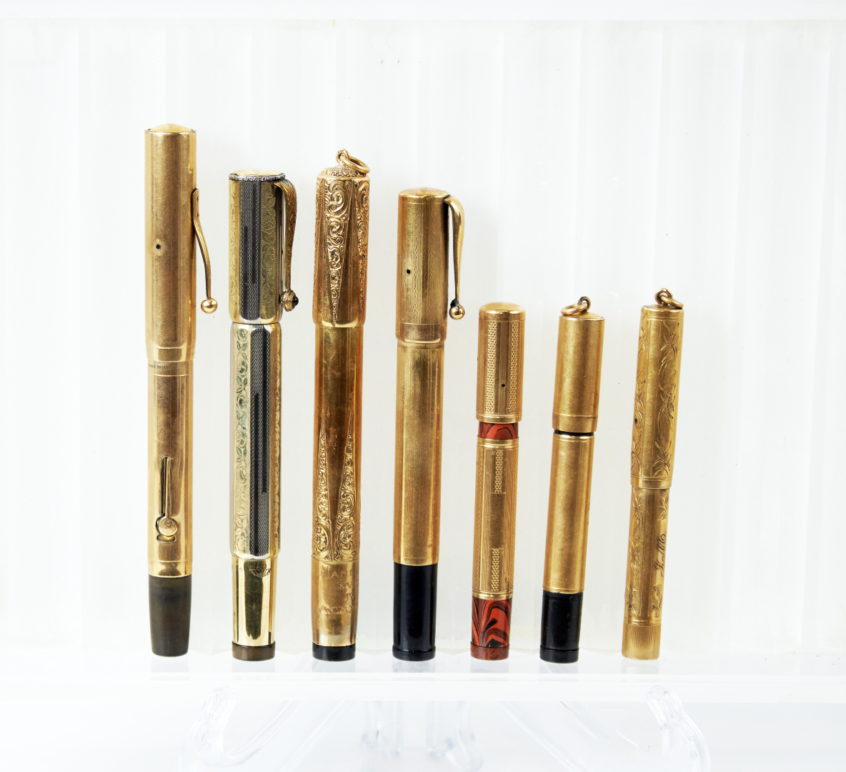 Gold-filled and black ebonite, including one in ripple red ebonite, with various decorations and engravings. One specimen in 18K gold, personalized “Manerbio” and dated April 18, 1927 (in Roman numerals). Signed gold nibs; five retractables and two lever-fill.