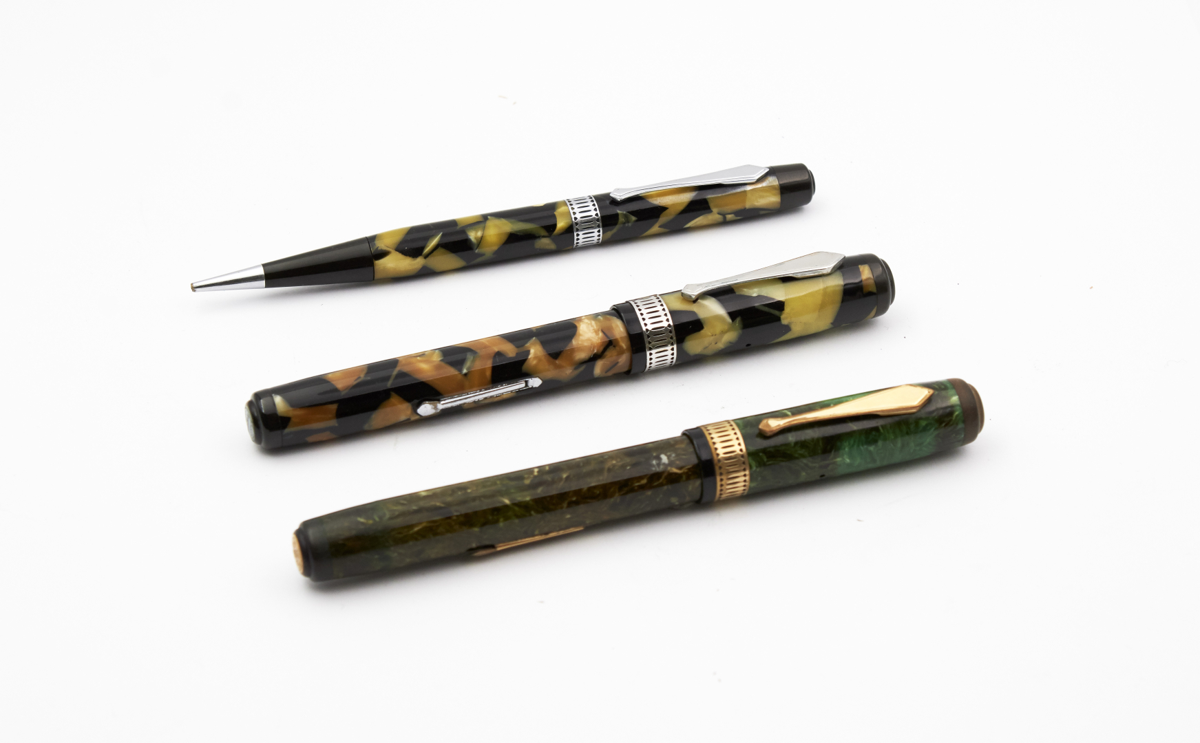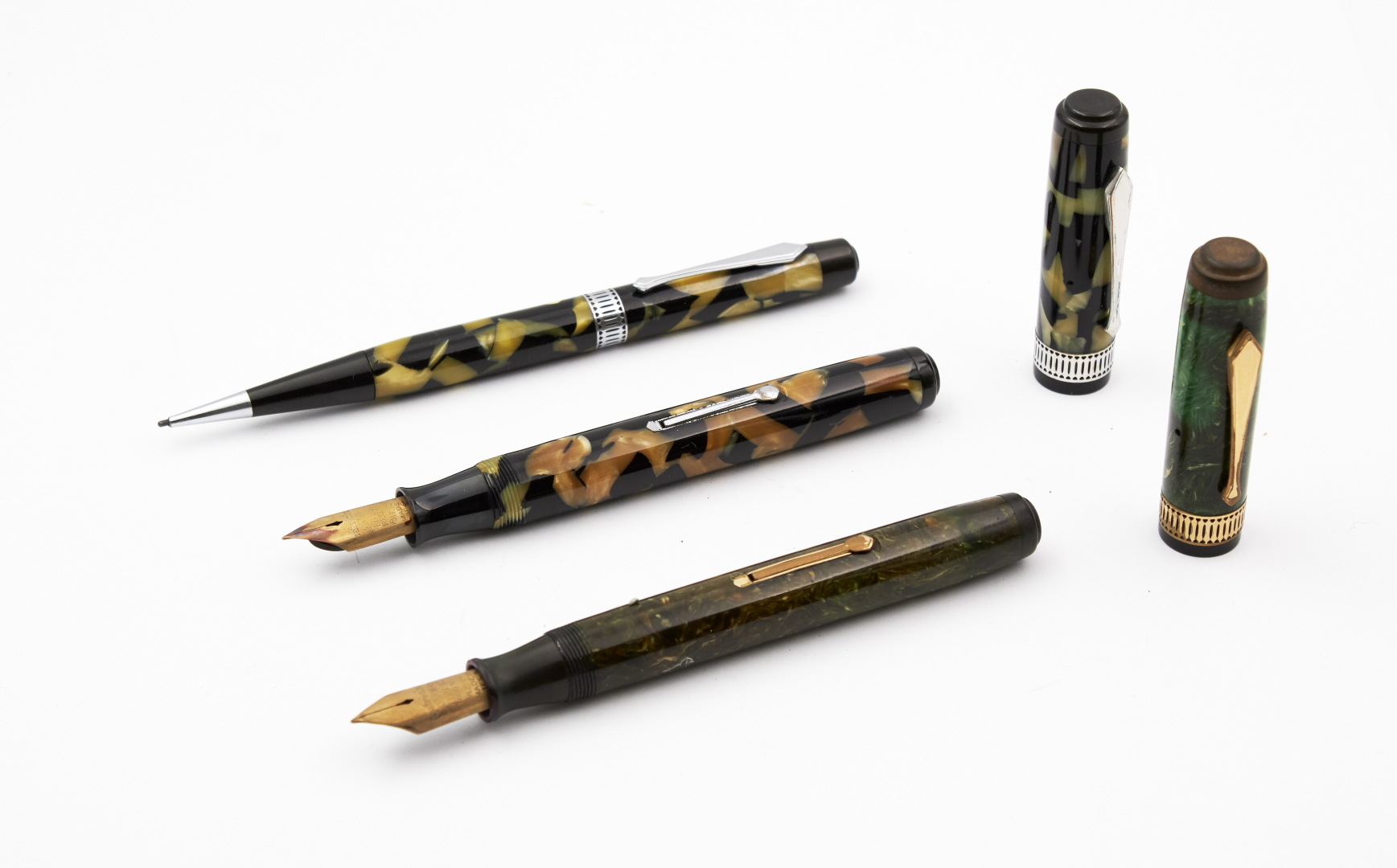 Signed gold nib, presumably size F and EF, lever-filler, respectively moss agate-colored and nacre celluloid.