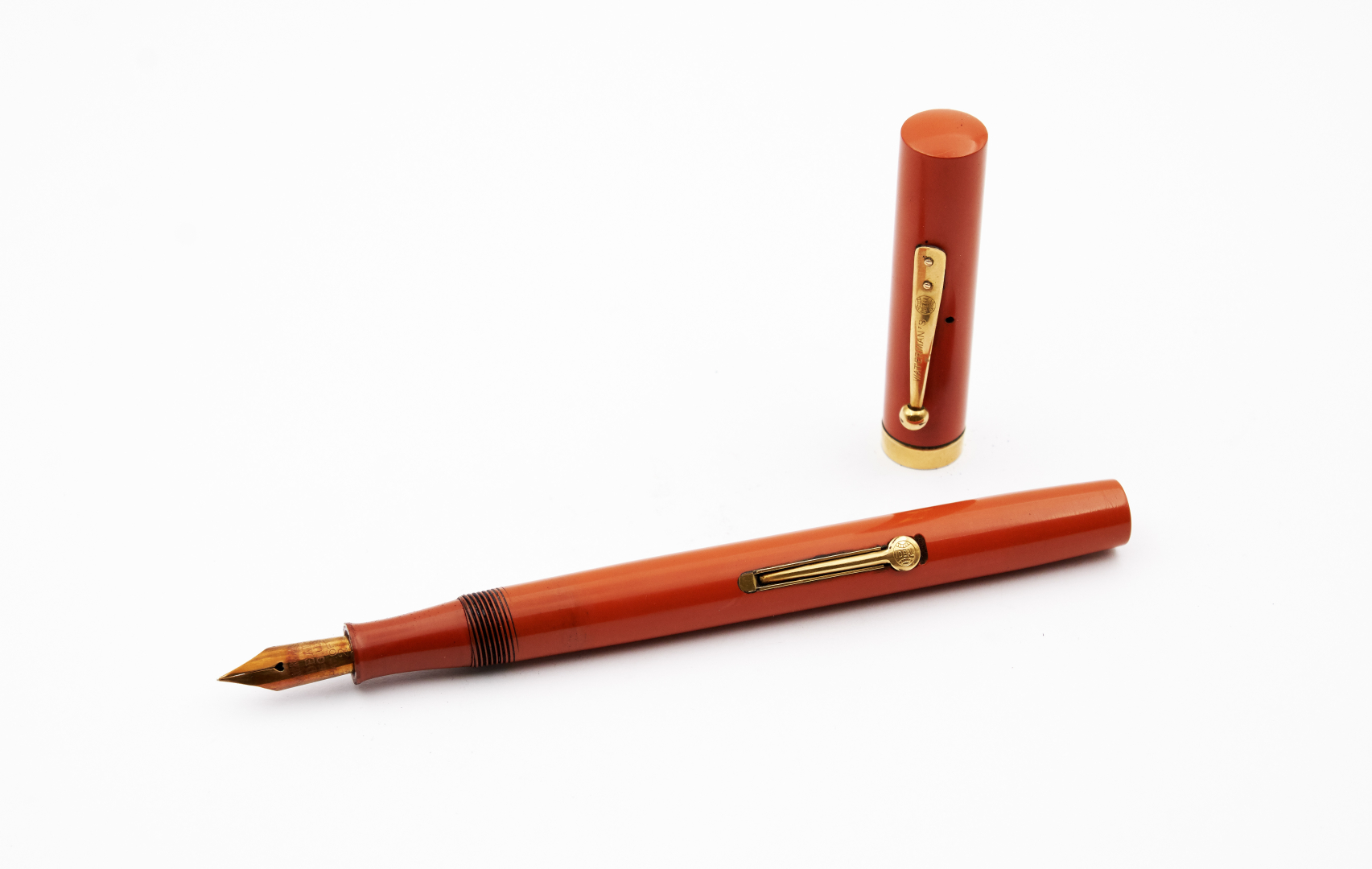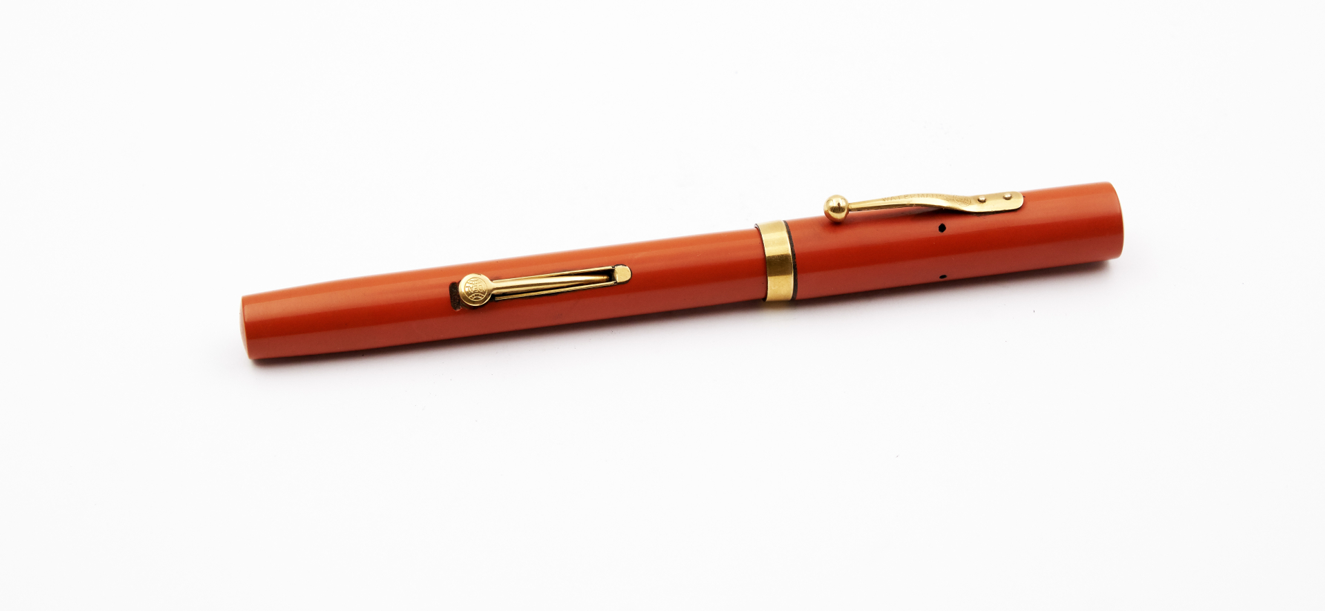 Signed gold nib, n. 2, presumably EF size, lever filler, orange ebonite body, n. 52 engraved on barrel end.