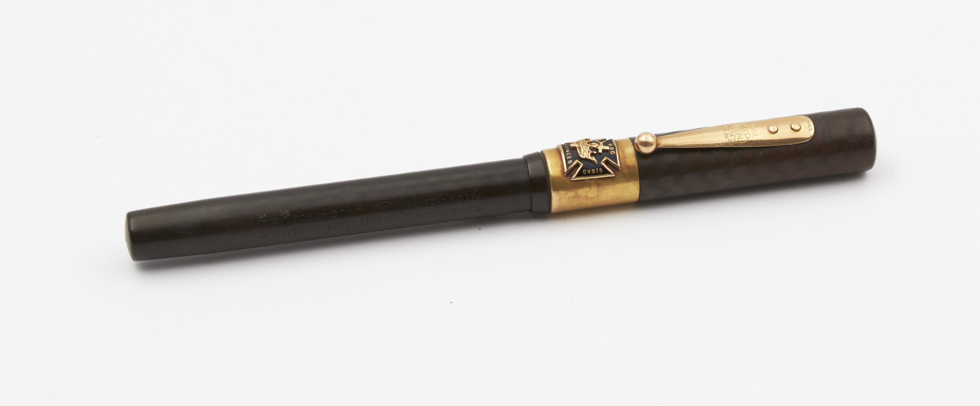 Signed gold nib, presumably F size, eyedropper filling, black ebonite barrel, n. 14 engraved on the end cap, 14K gold clip and cap band adorned with the Templar seal: “In Hoc Signo Vinces” with cross and crown.