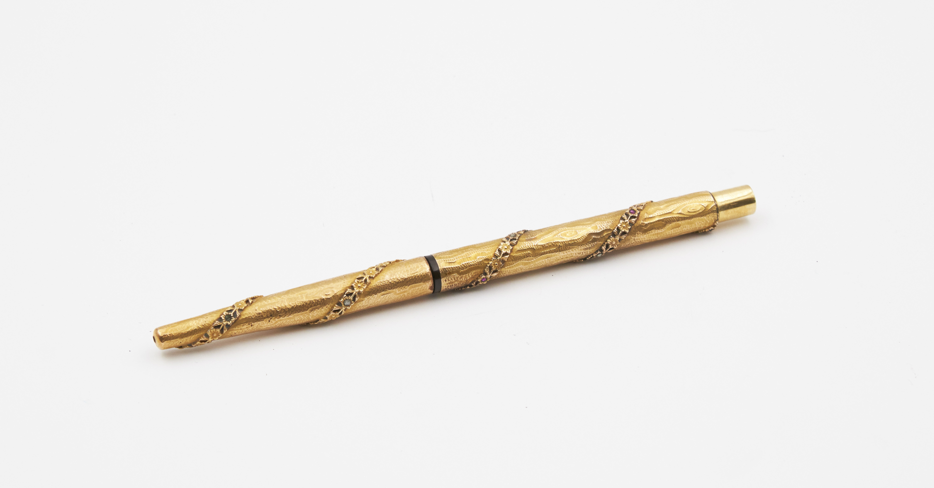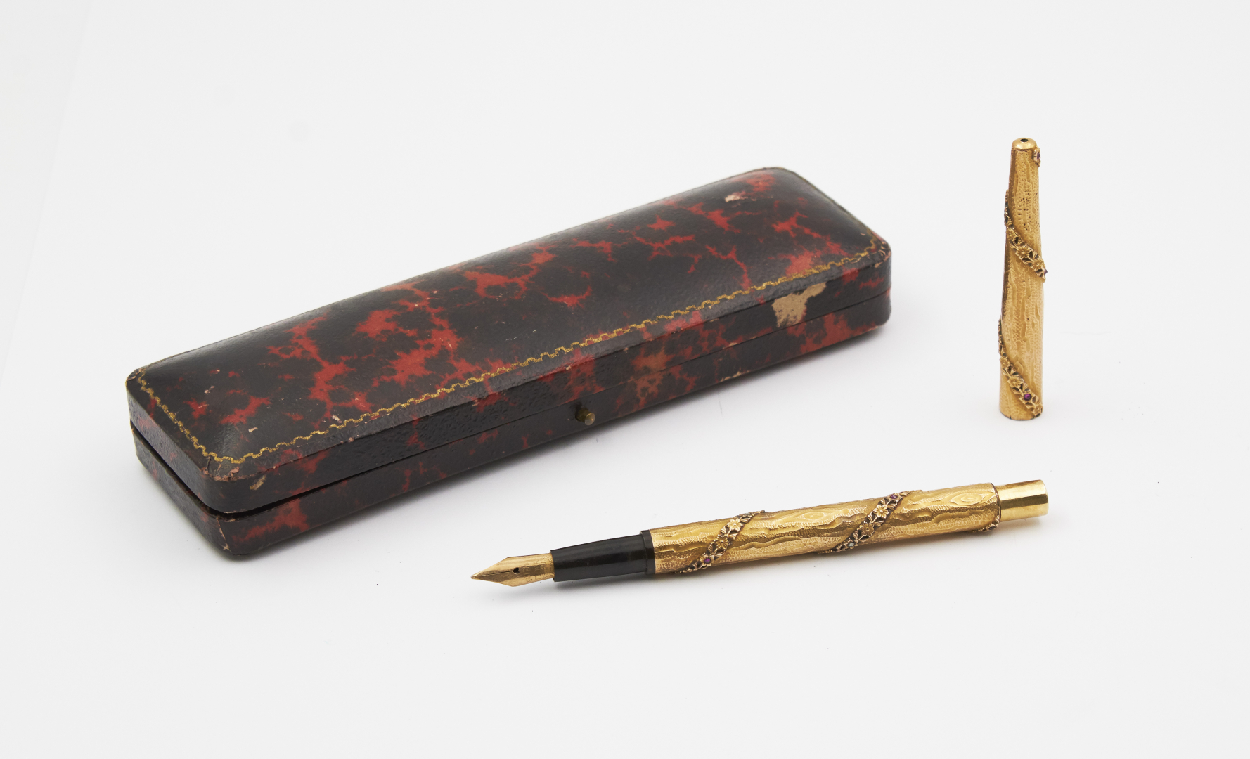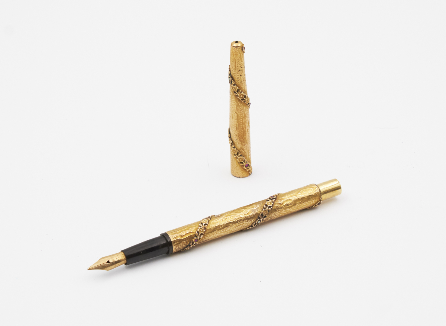 Signed gold nib, presumably M size, eyedropper filling, gold-rolled with bark-effect and raised twisted garland decoration embellished with small stones.