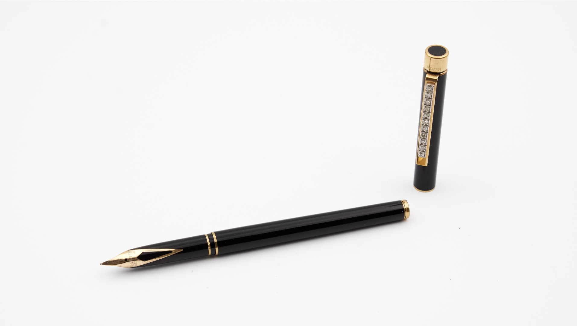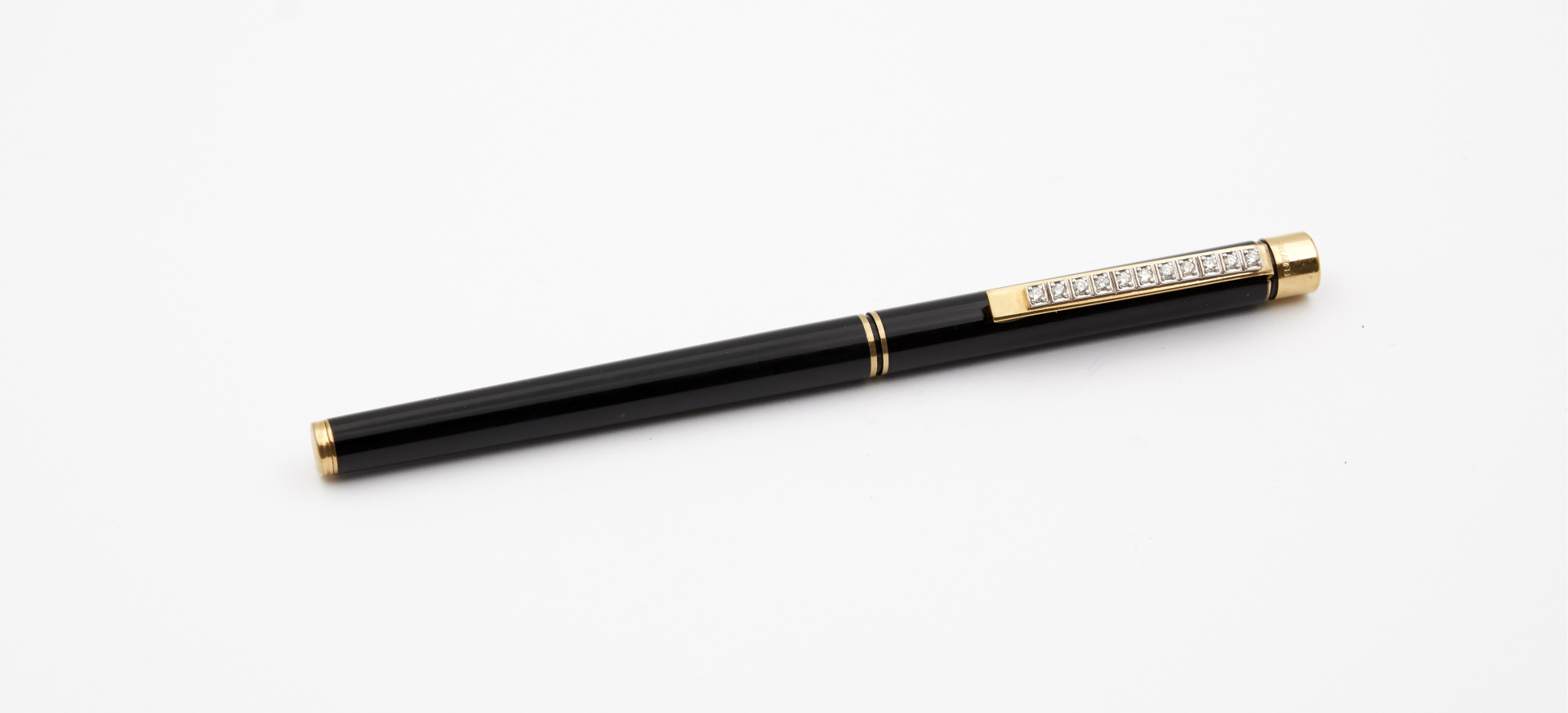 Signed 14K gold nib, M size, converter filler, black lacquer with gilt accent, clip set with small diamonds.