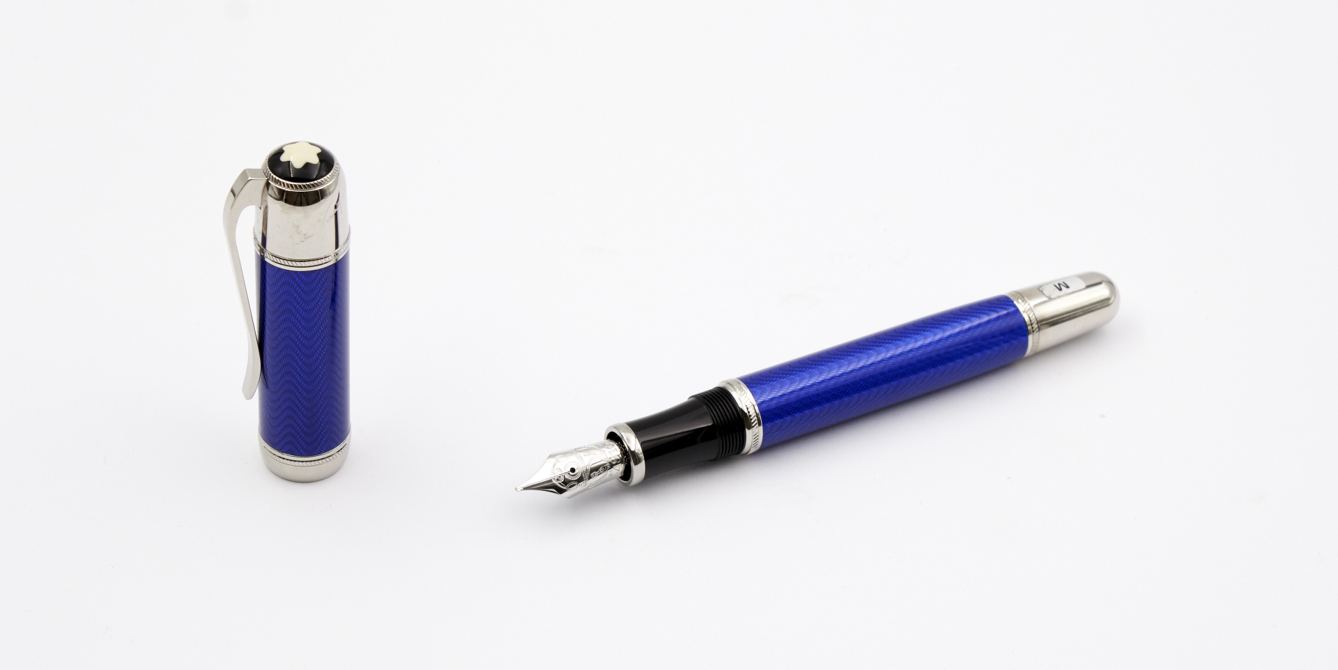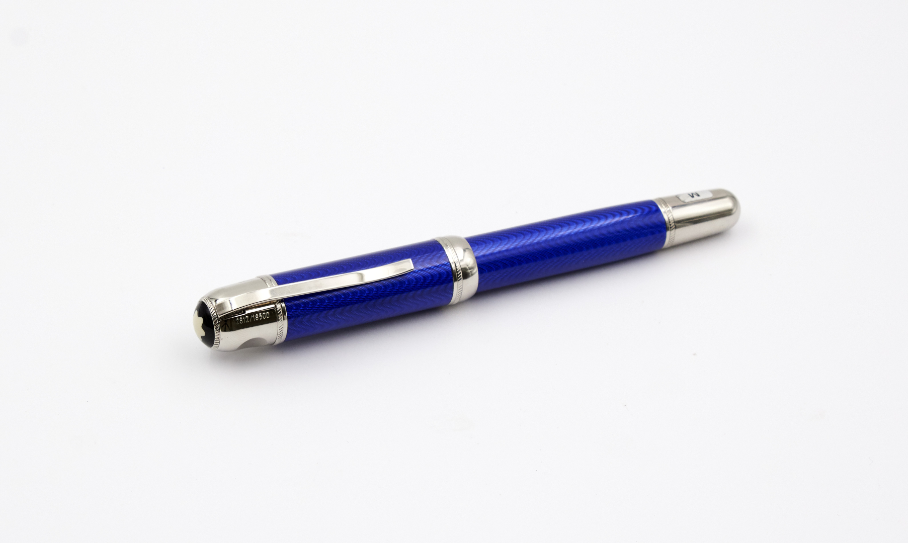 N. 12812/18500, signed 18K rhodium-plated gold nib, signed, size M, piston filler, translucent blue guilloché body.