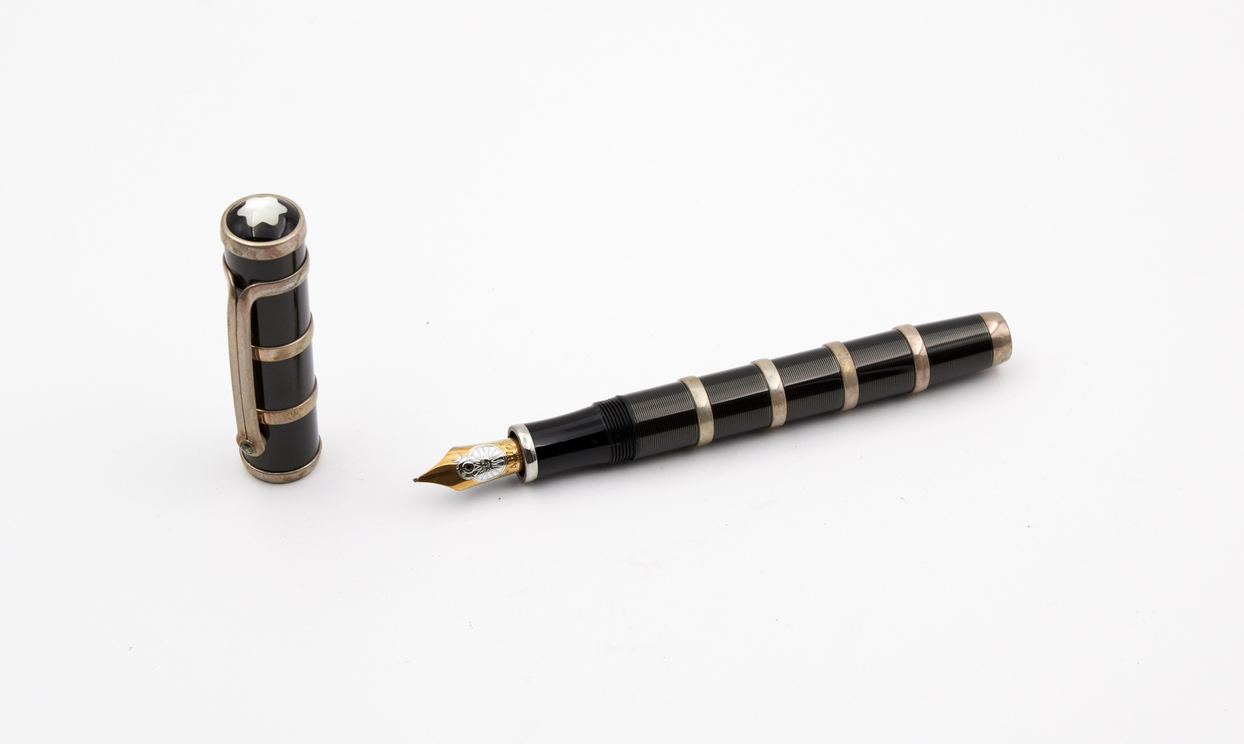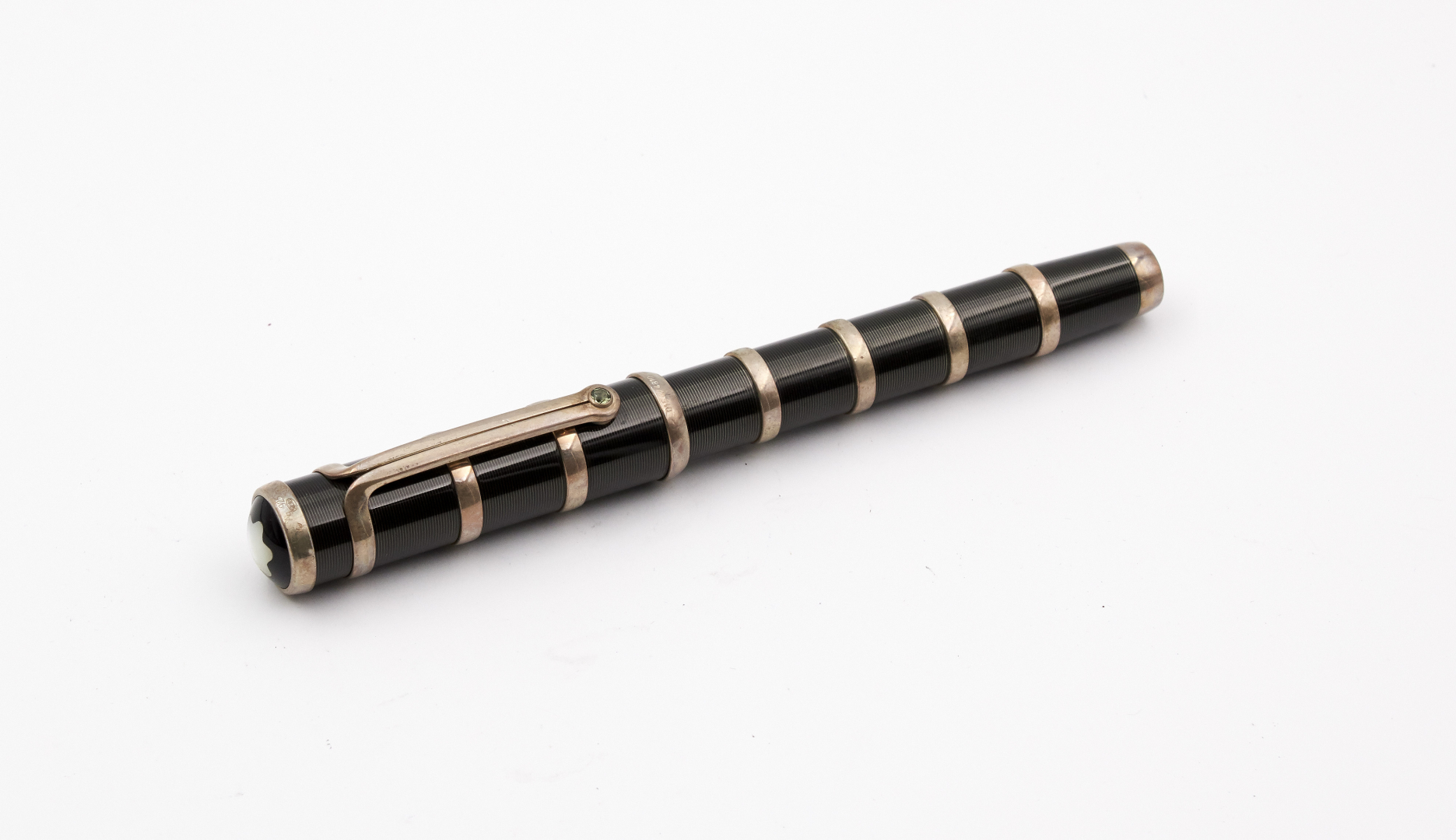 N. 0154/4810, signed two-tone 18K gold nib, size M, piston filler, engraved anthracite body and 925 silver rings, stone-set clip.