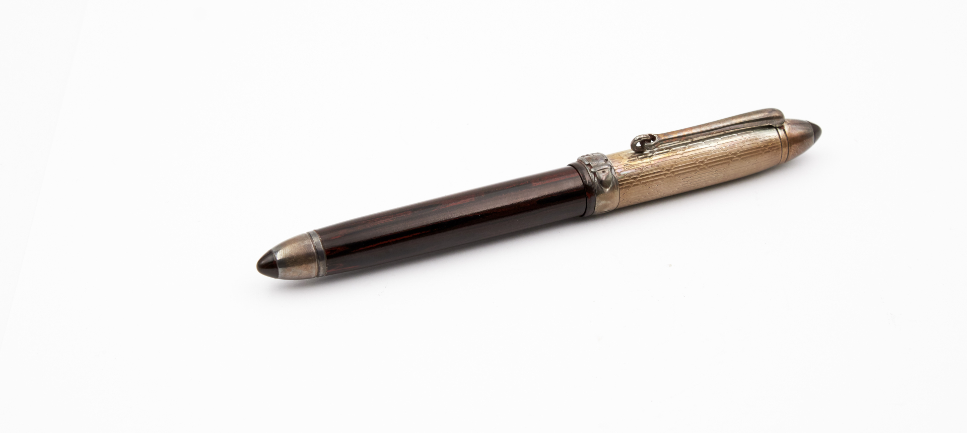 Signed 18K two-tone gold nib, size F, converter filler, silver cap and ebonite body, personalized with "B" and "888" in Roman numerals.