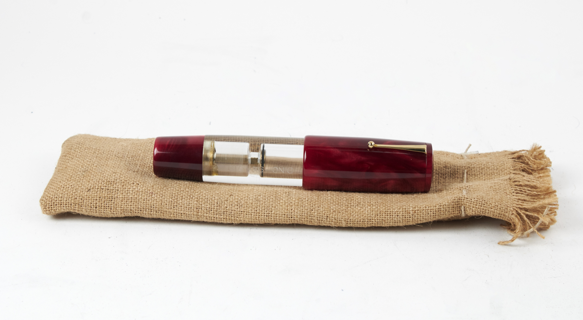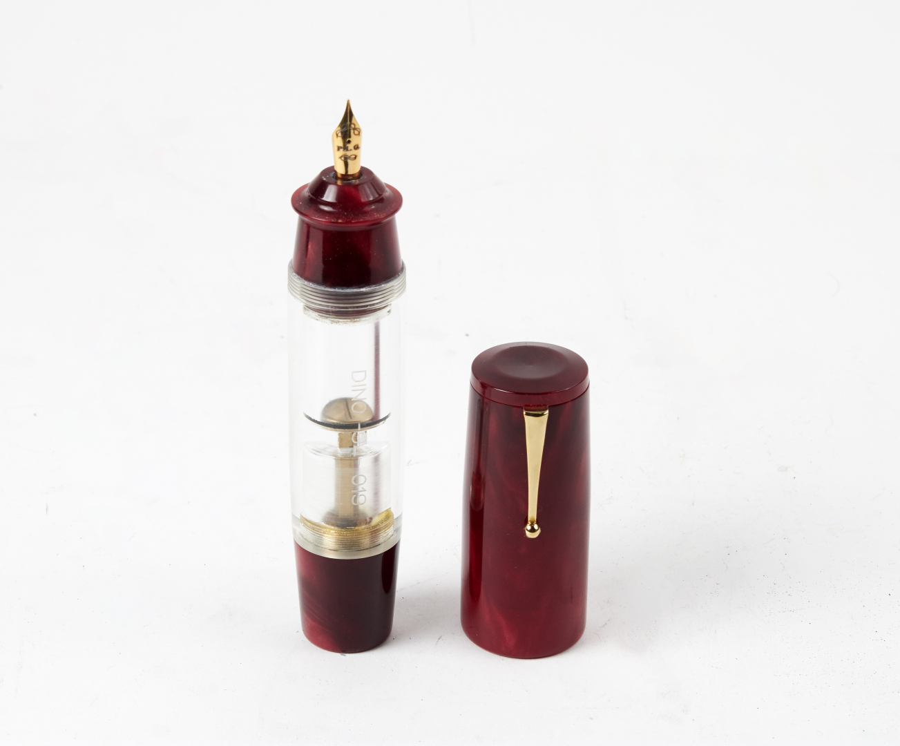 Signed nib, presumably size F, piston filler, transparent lucite, mottled red resin, engraved "Dino -94-019".