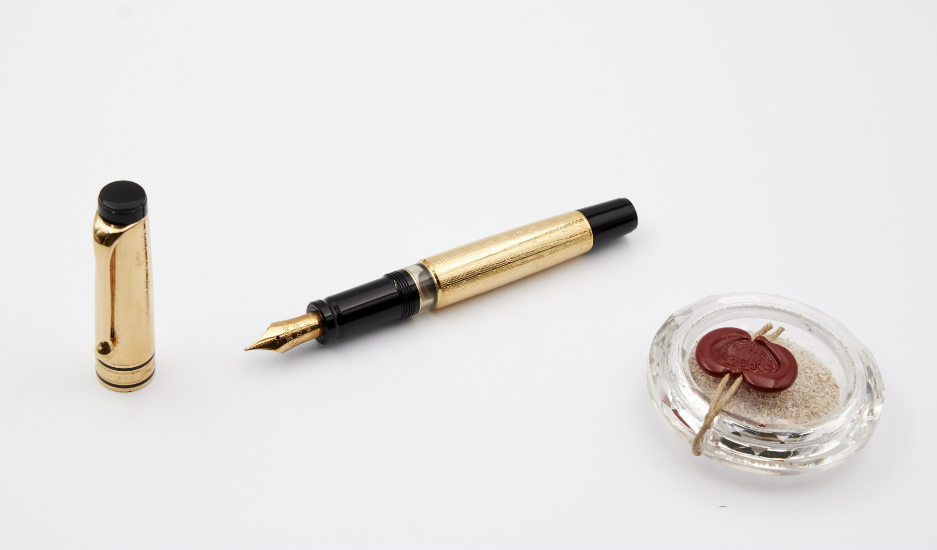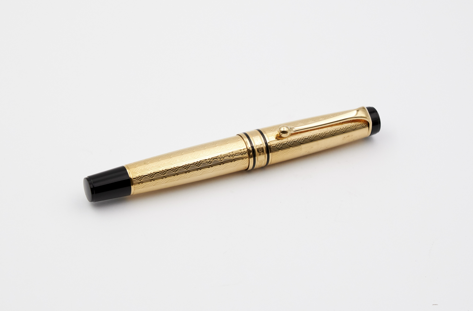 N. 0082, signed 18K gold nib, size presumably M, piston filler, gold-plated and engraved.
