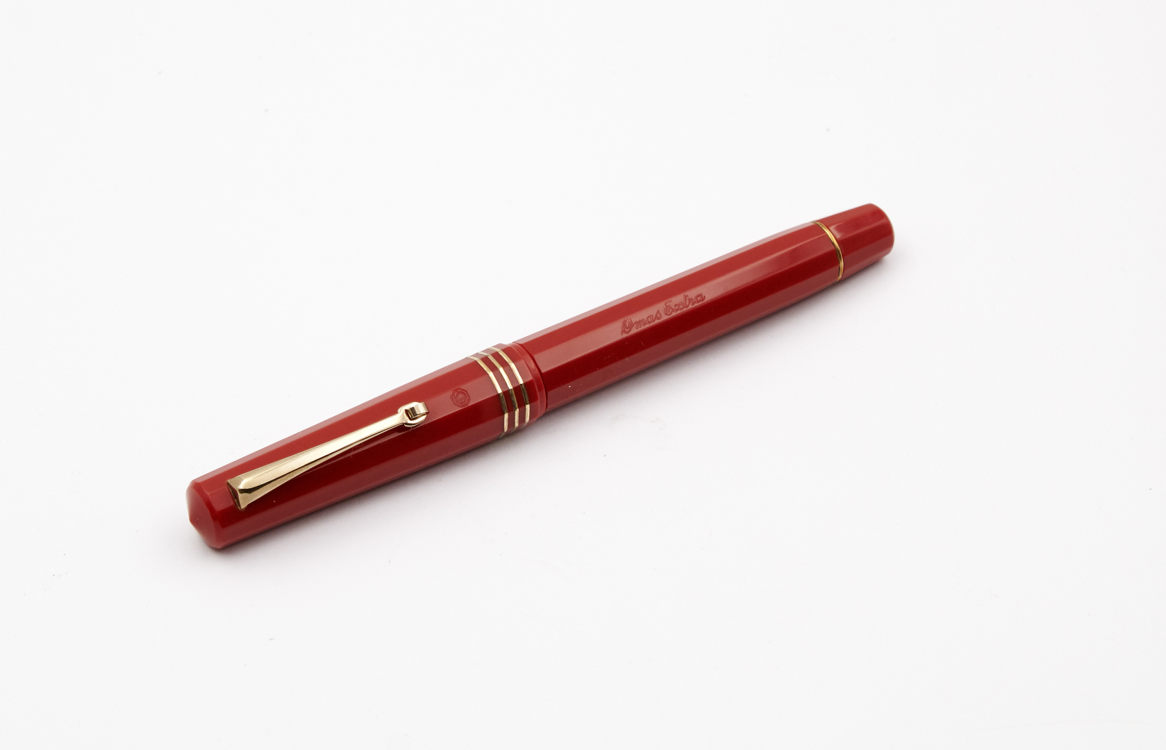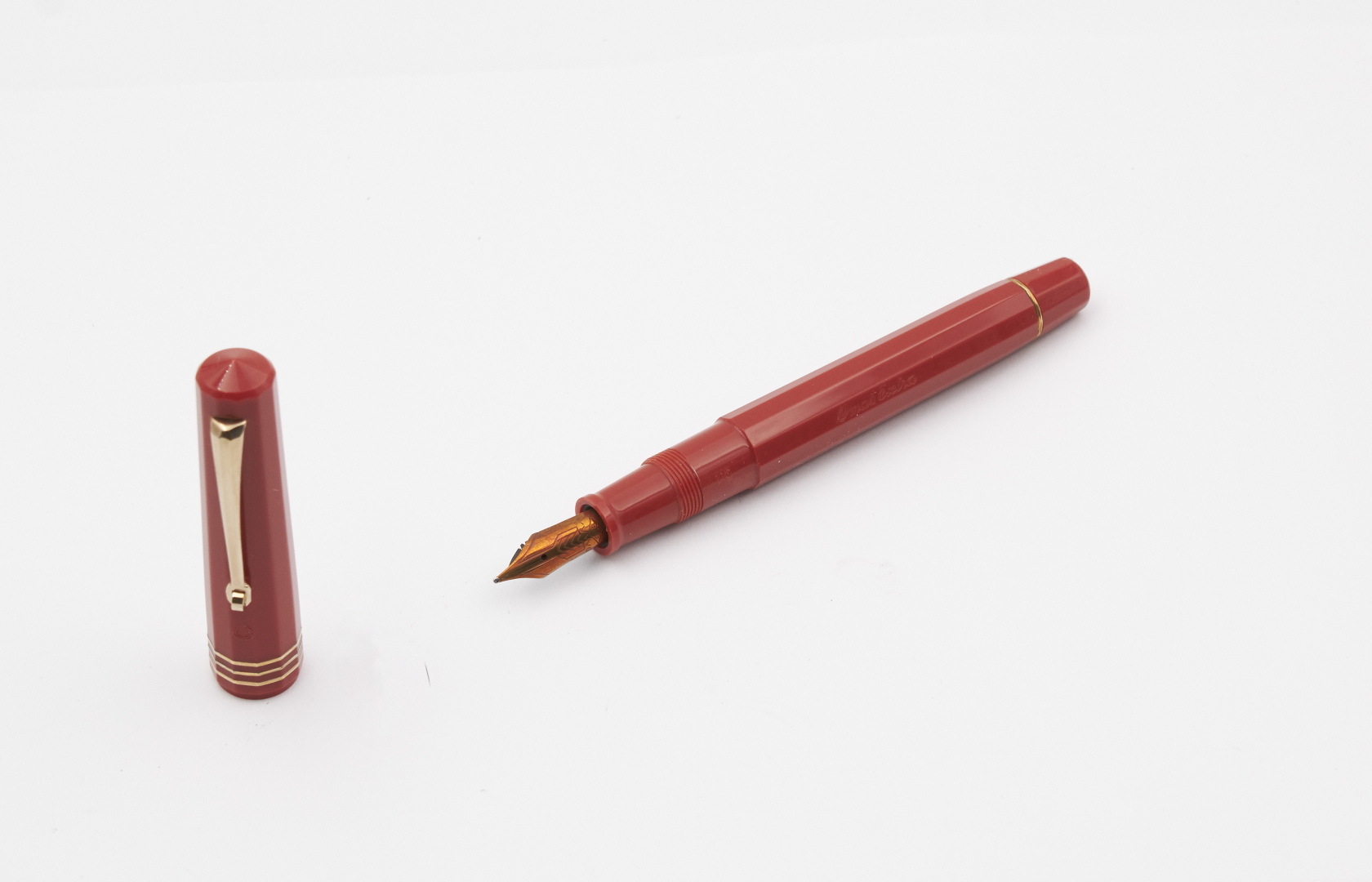 N. 116, signed 14K gold nib, size M, piston filler, coral-colored resin.