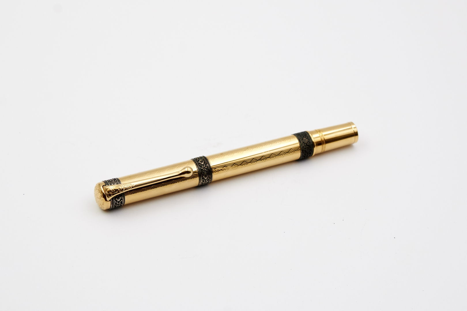 N. 0177, 18K gold nib, signed, size M, piston filler, gilded and with silver decorations.