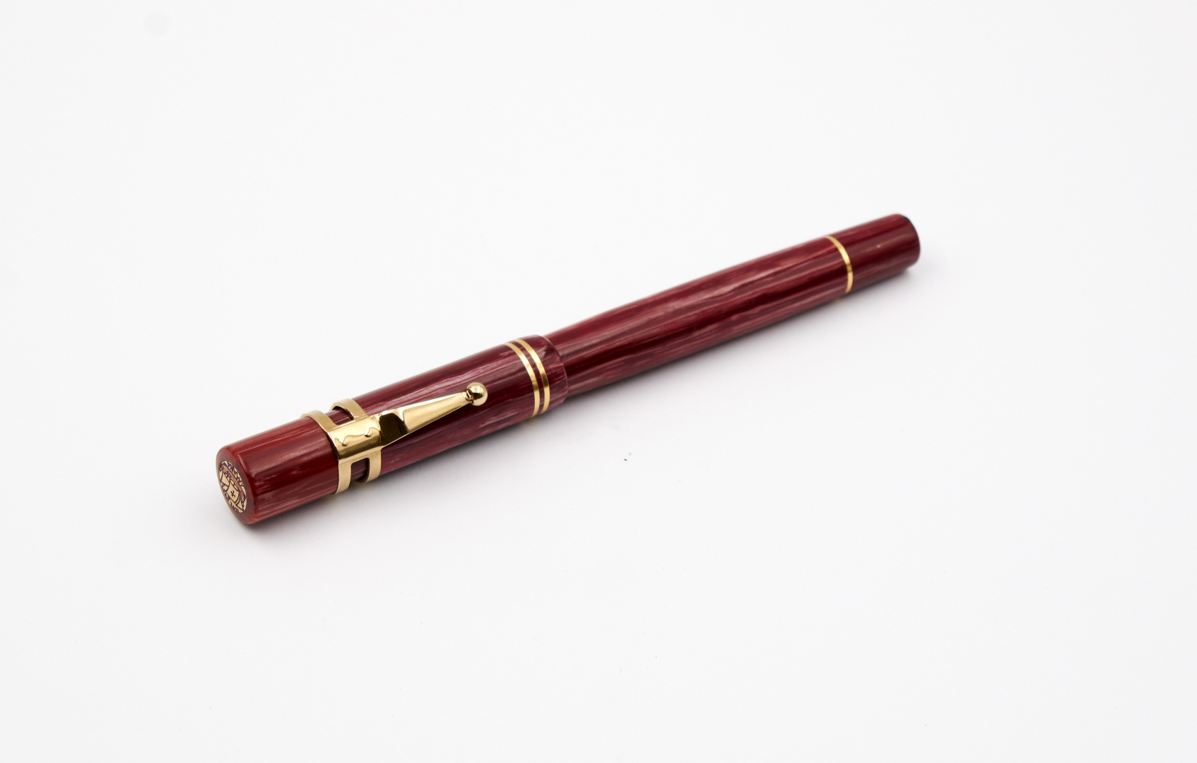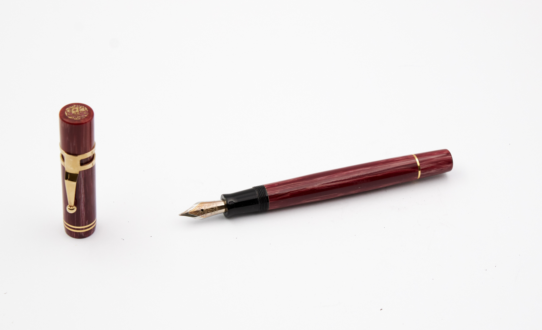 N. 019/500, 14K gold nib, signed, piston filler, body with marbled purple wood effect.