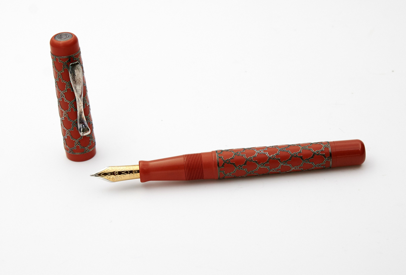 Light red ebonite decorated with silver filigree depicting the ornaments of the Alhambra, the Red Palace of Granada.