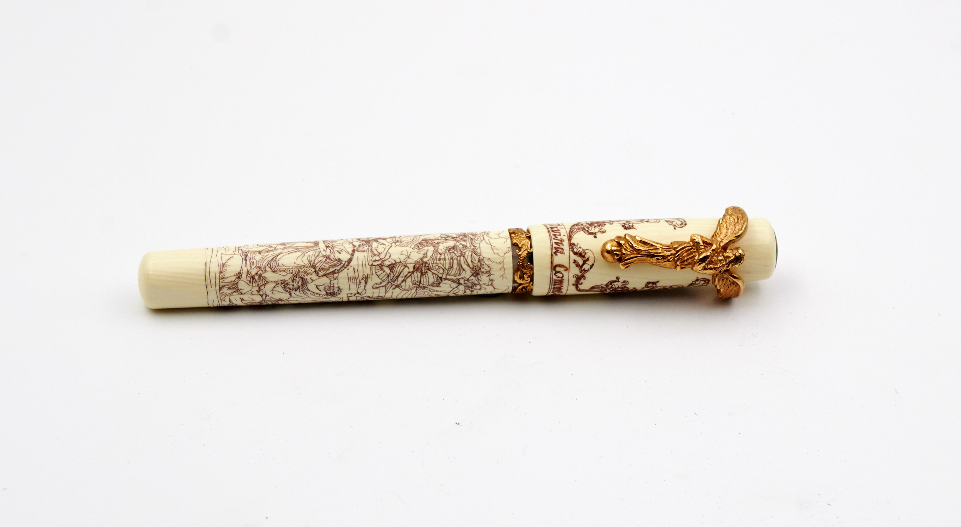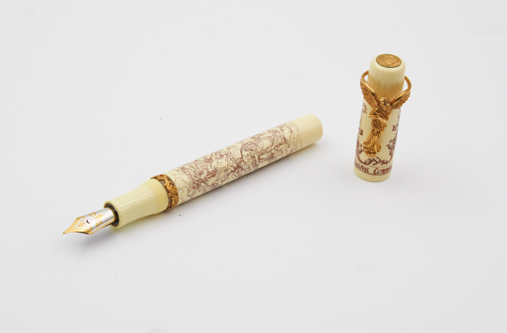 N. 19/88, signed 18K gold nib, presumably size F, double reservoir filler, ivory-colored celluloid with scrimshaw engraving, angel-shaped clip.