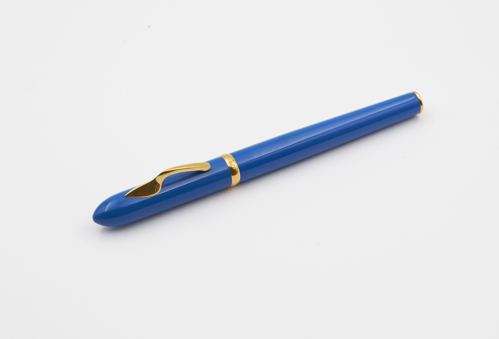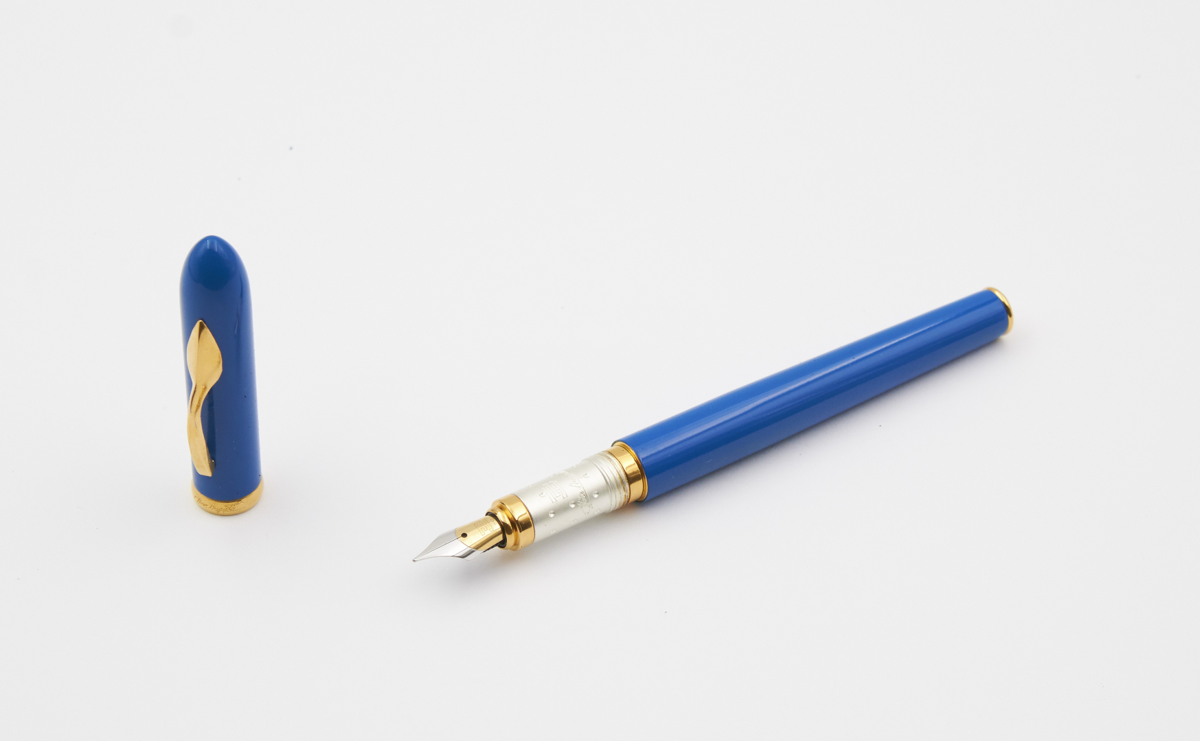 Signed 18K two-tone gold nib, presumably size F, converter filler, blue lacquer.