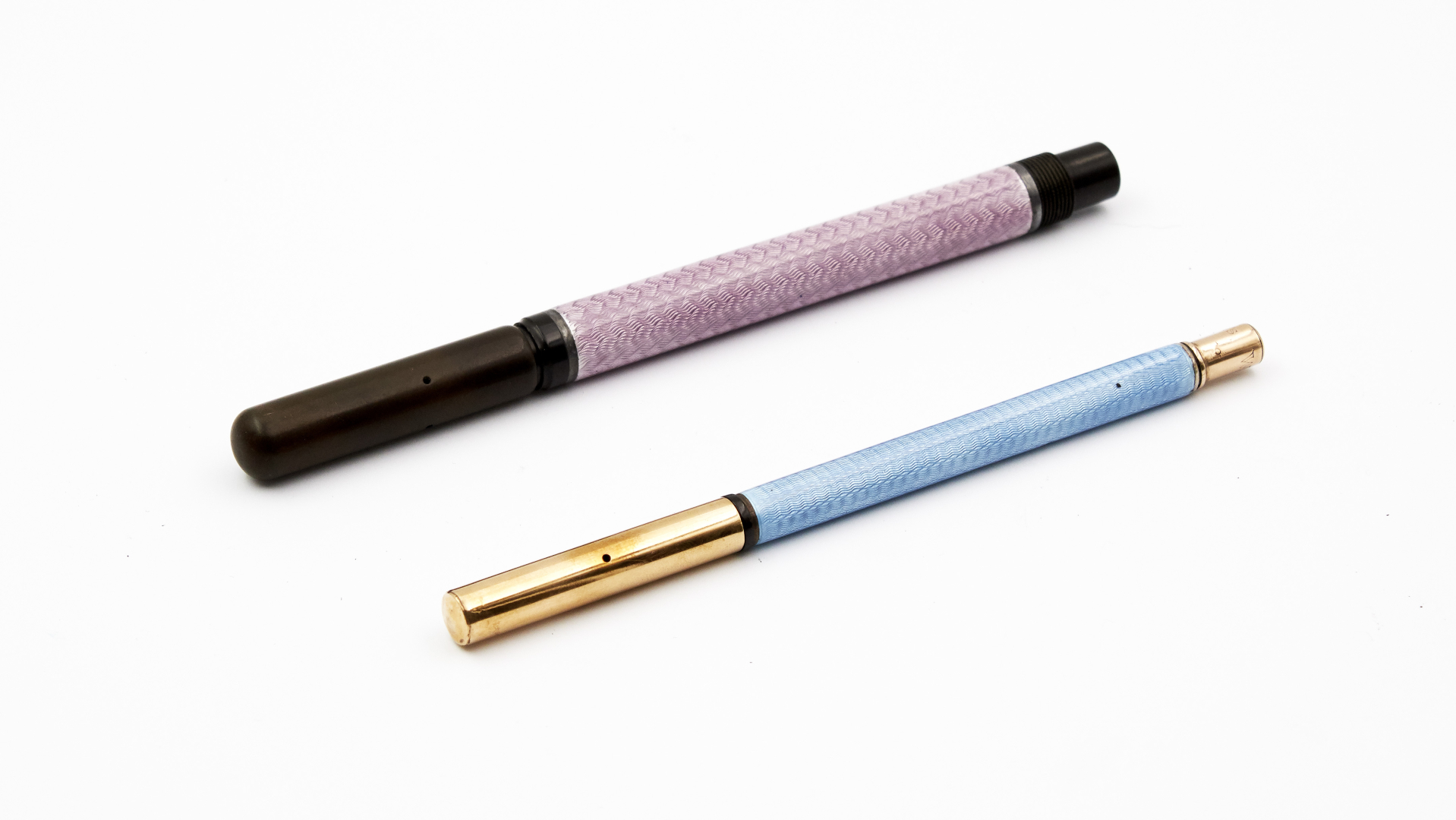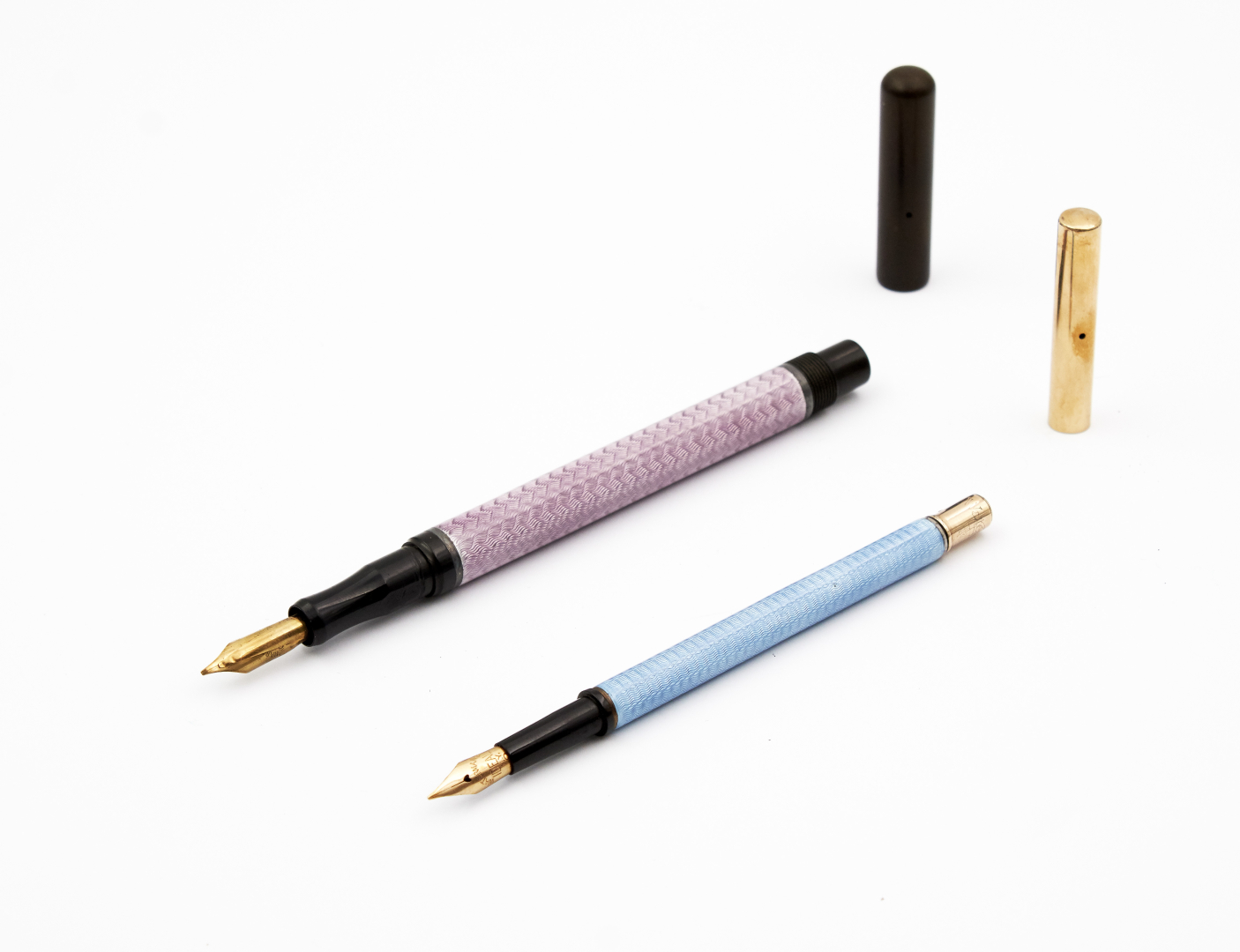 One unsigned example, ebonite barrel and translucent light purple guilloché enamel, piston filling system.