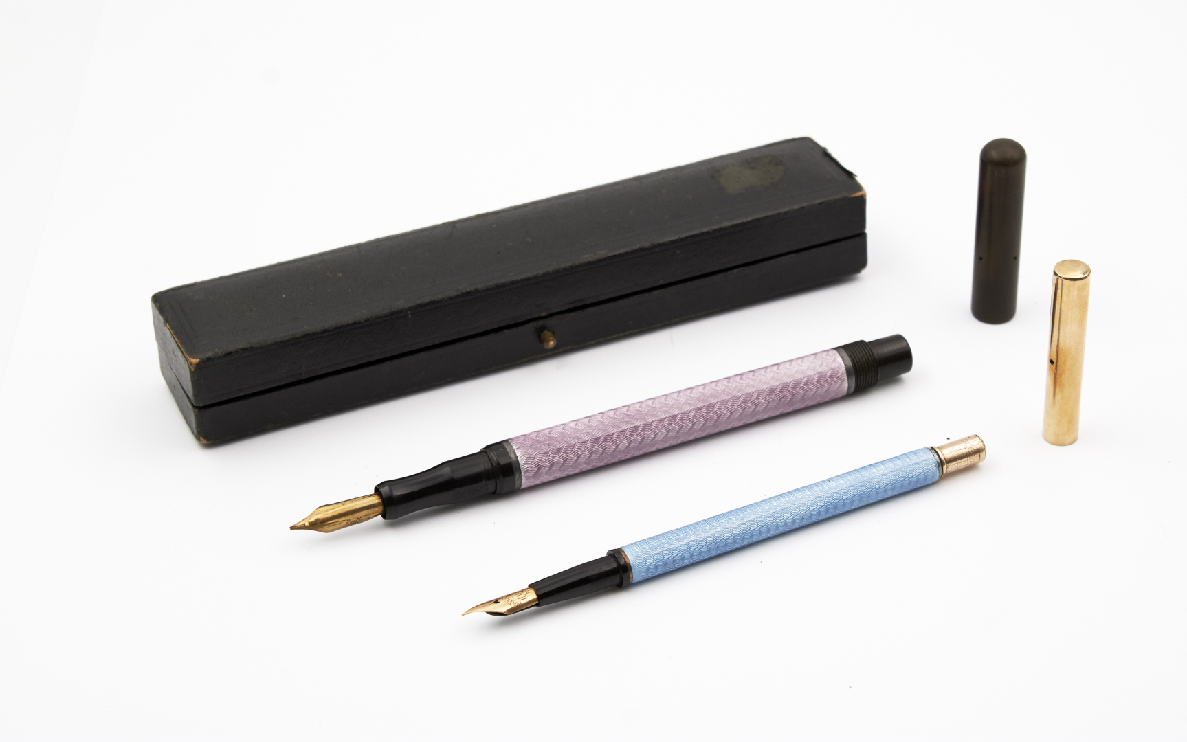 One example signed Waterman’s Ideal on the end cap and nib, gold-plated and translucent light blue guilloché enamel.