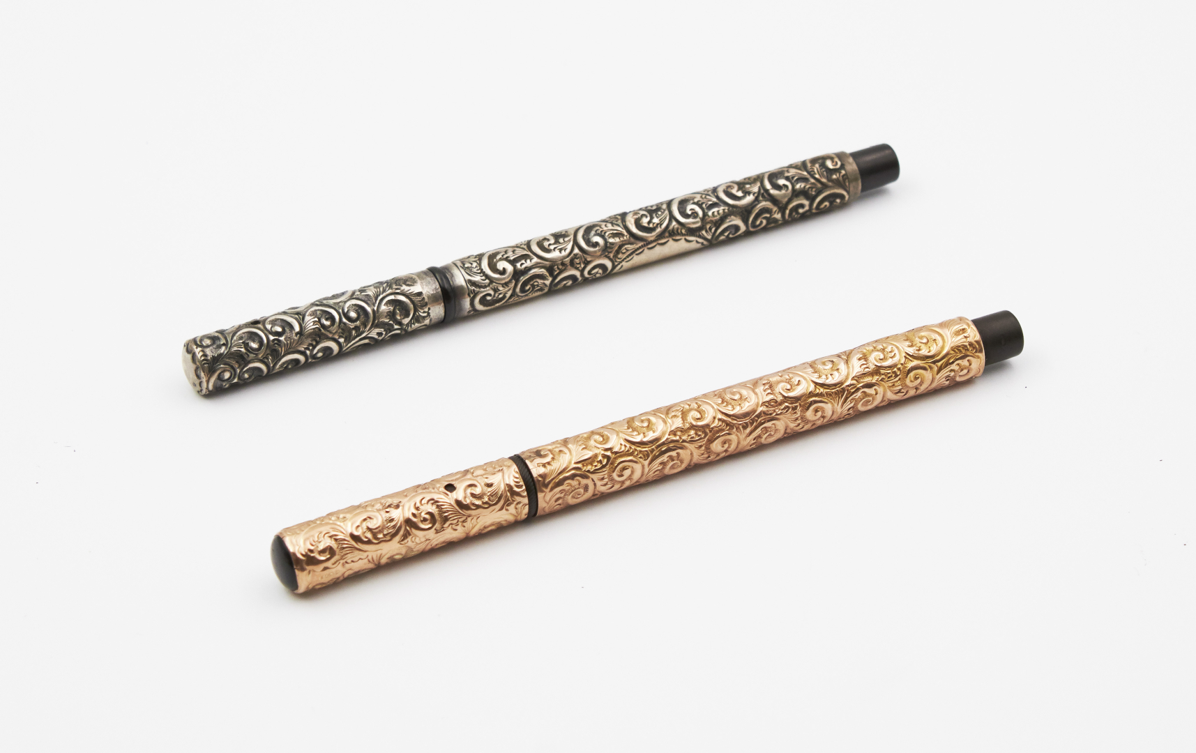 Two fountain pens in ebonite overlaid respectively in 9K gold and silver, with English hallmarks, embossed with scrollwork decoration. The gold example bears an engraved name.
