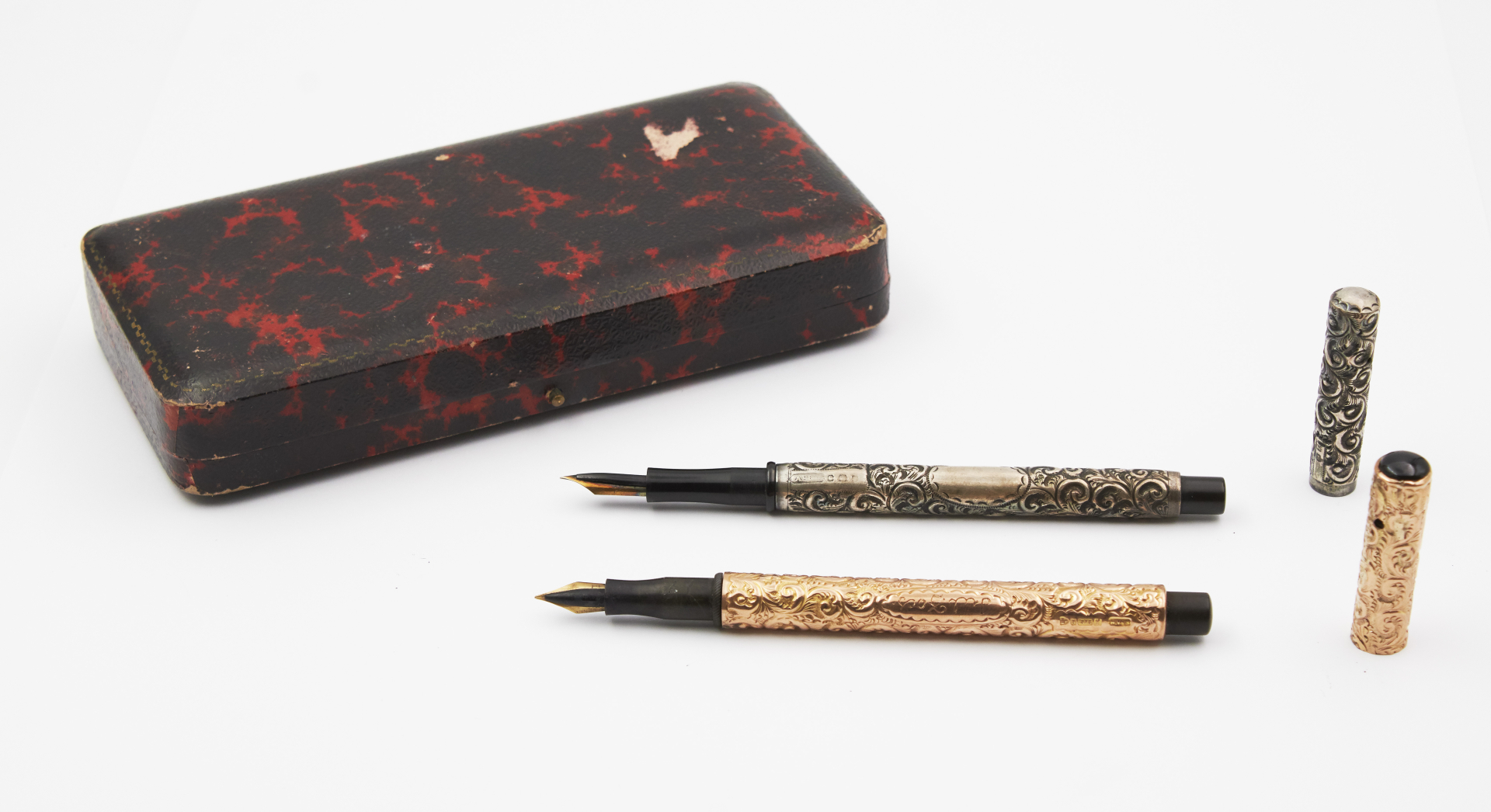 LOT OF TWO GOLD AND SILVER FOUNTAIN PENS, PRESUMABLY MABIE TODD