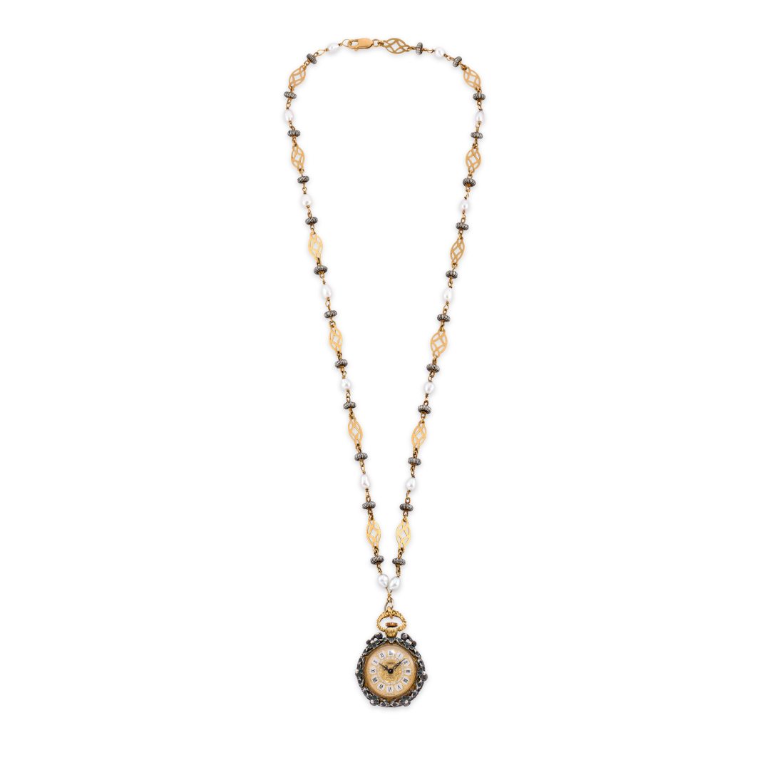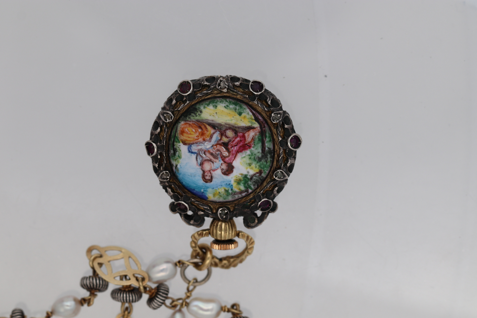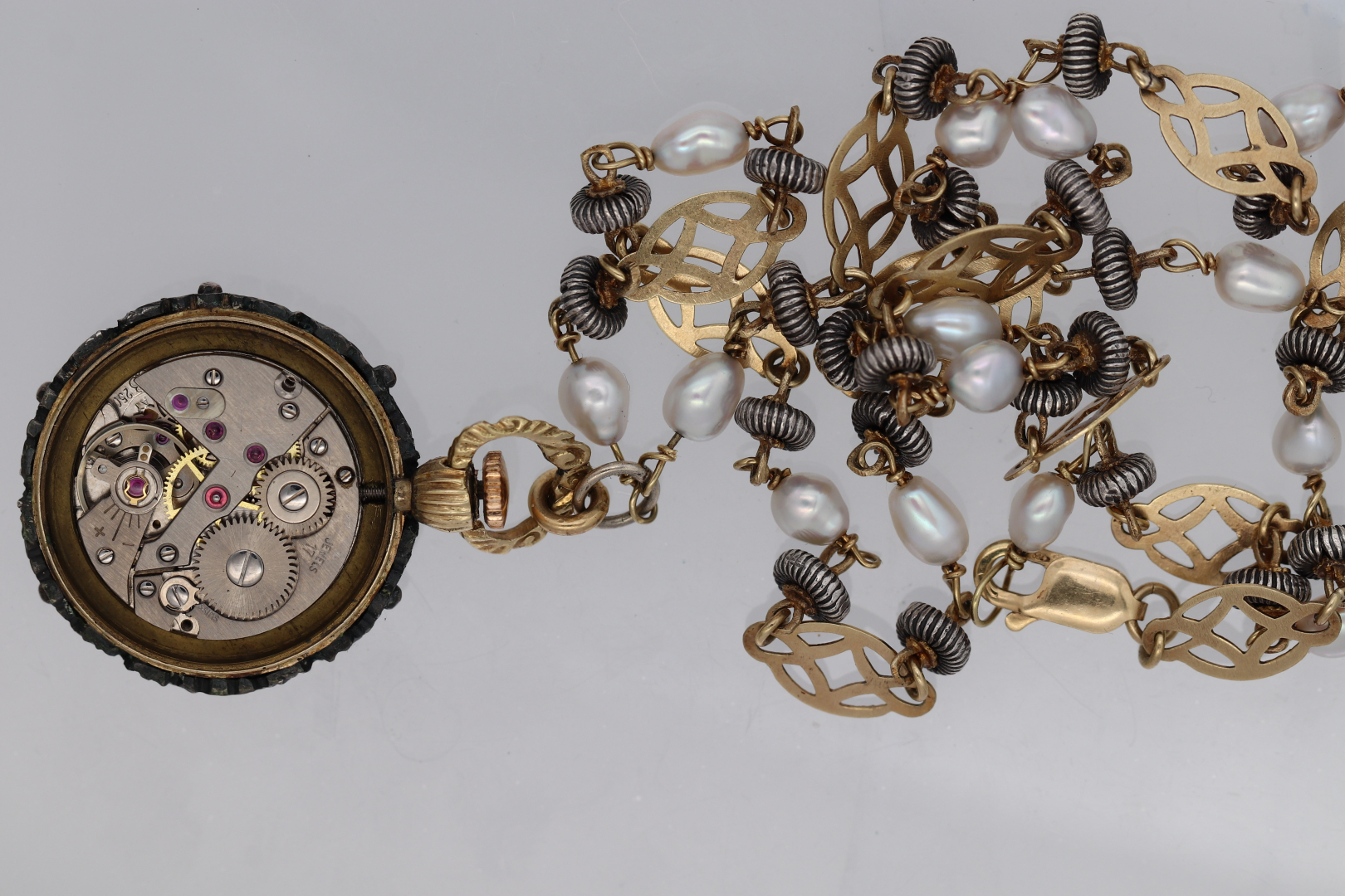 Case: in 18K gold, snap on caseback, silver decoration with enamelled medallion. 18K gold chain alternating with silver and pearl elements.