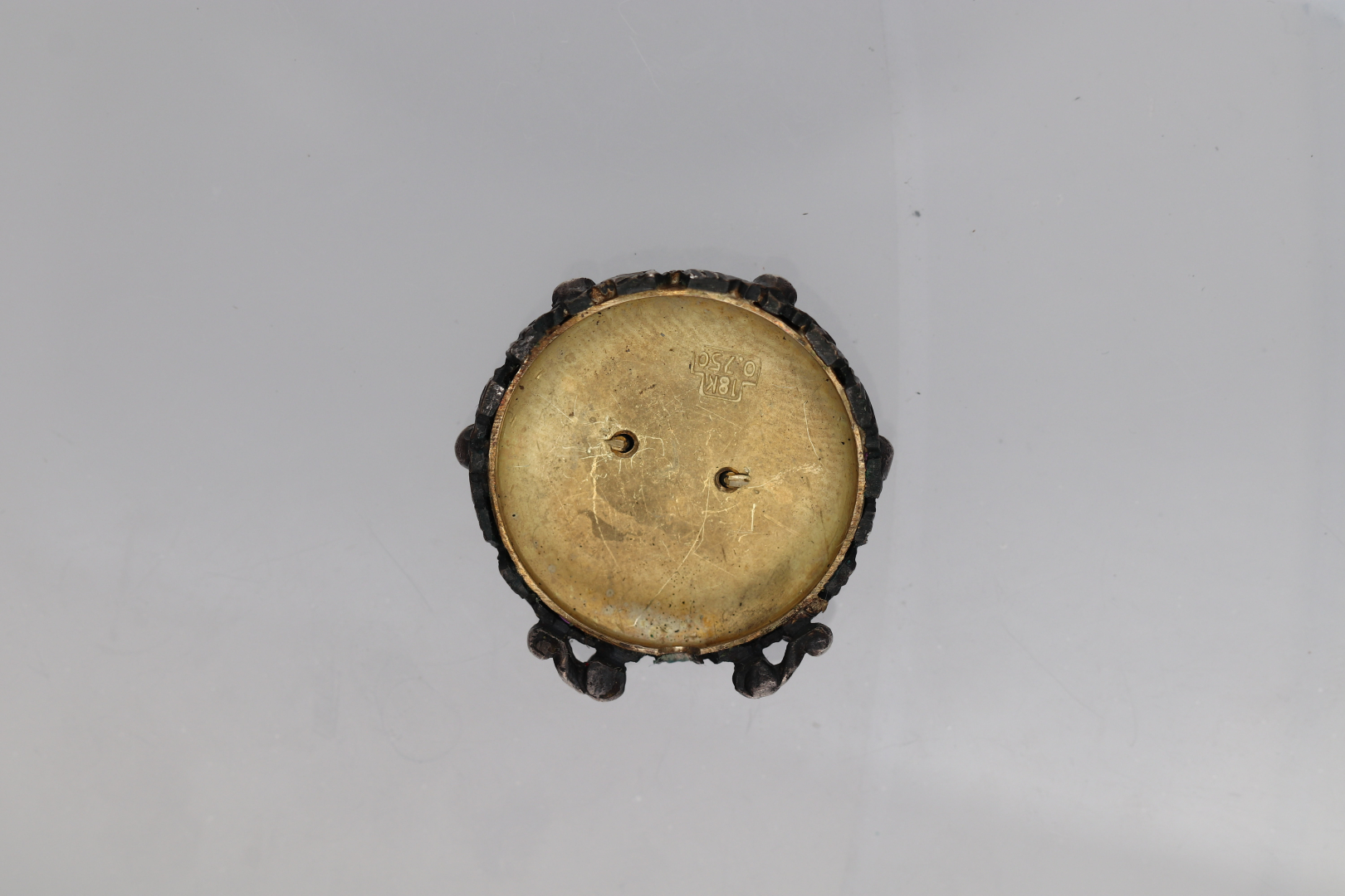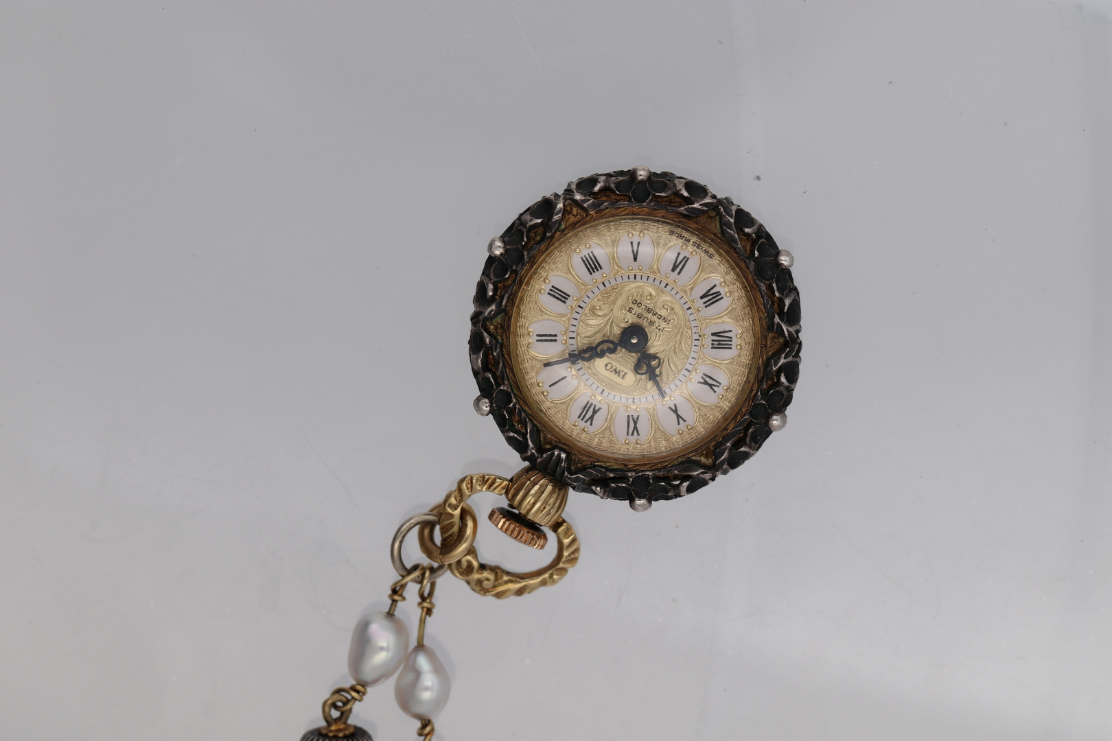Dial: signed “I.W.O.”, gilt metal in Renaissance style, numerals within cartouches.