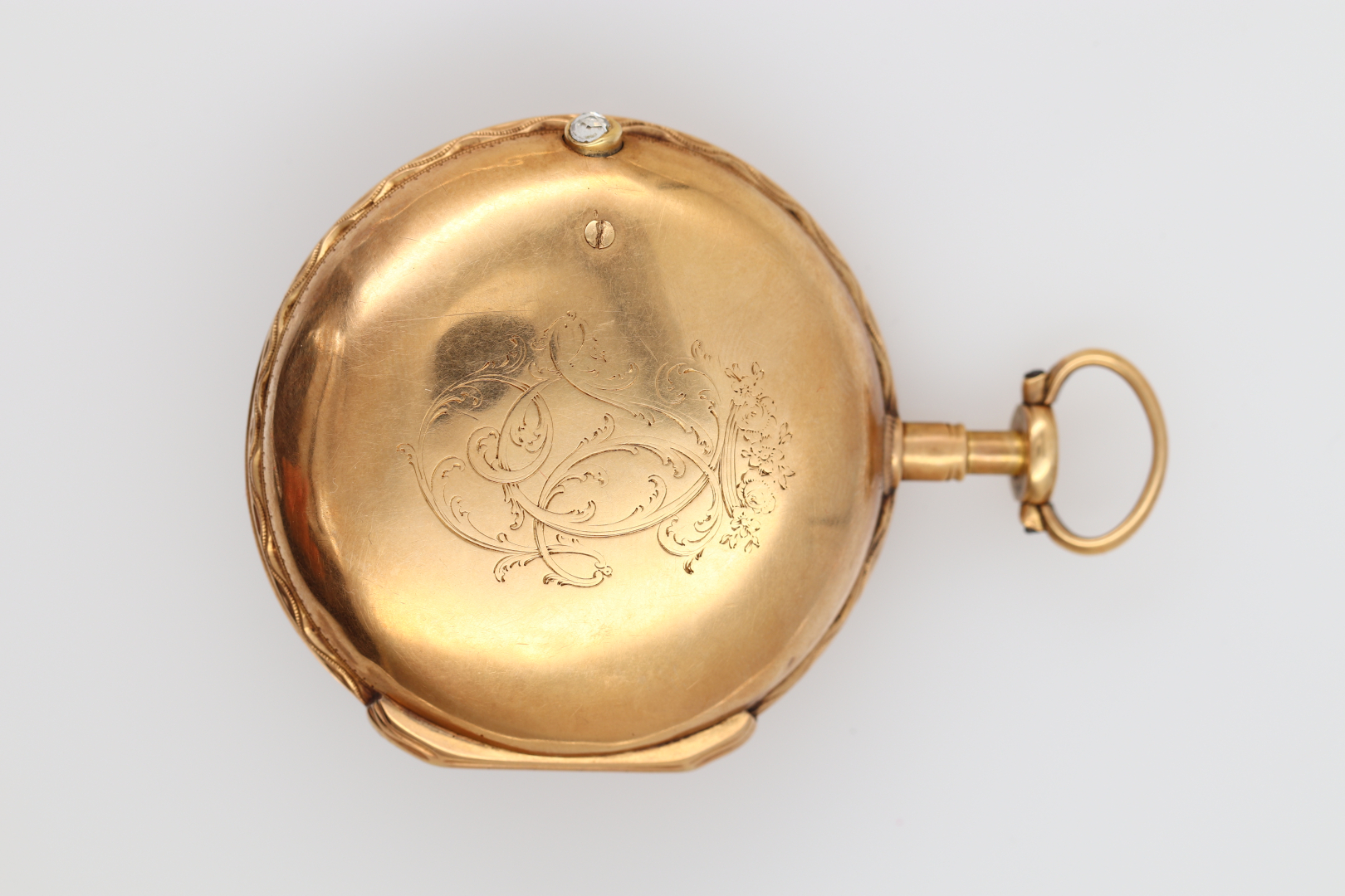 Case: in gold, two-body case, back engraved with monogram. Dial: white enamel, painted numerals. Movement: key-wound with fusee, verge escapement. Accessories: – Diameter: 45 mm | Weight: 67 g Note: running at the time of cataloguing.