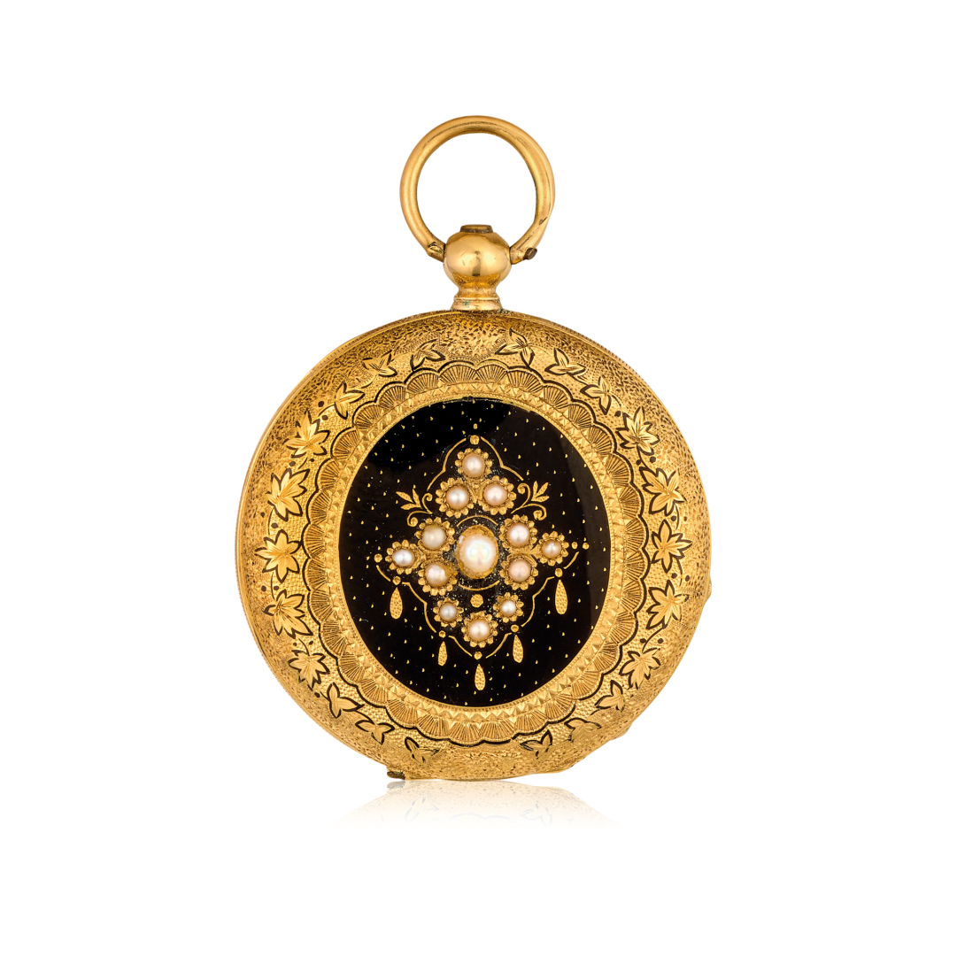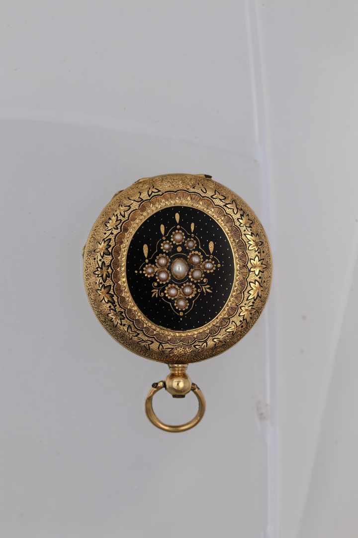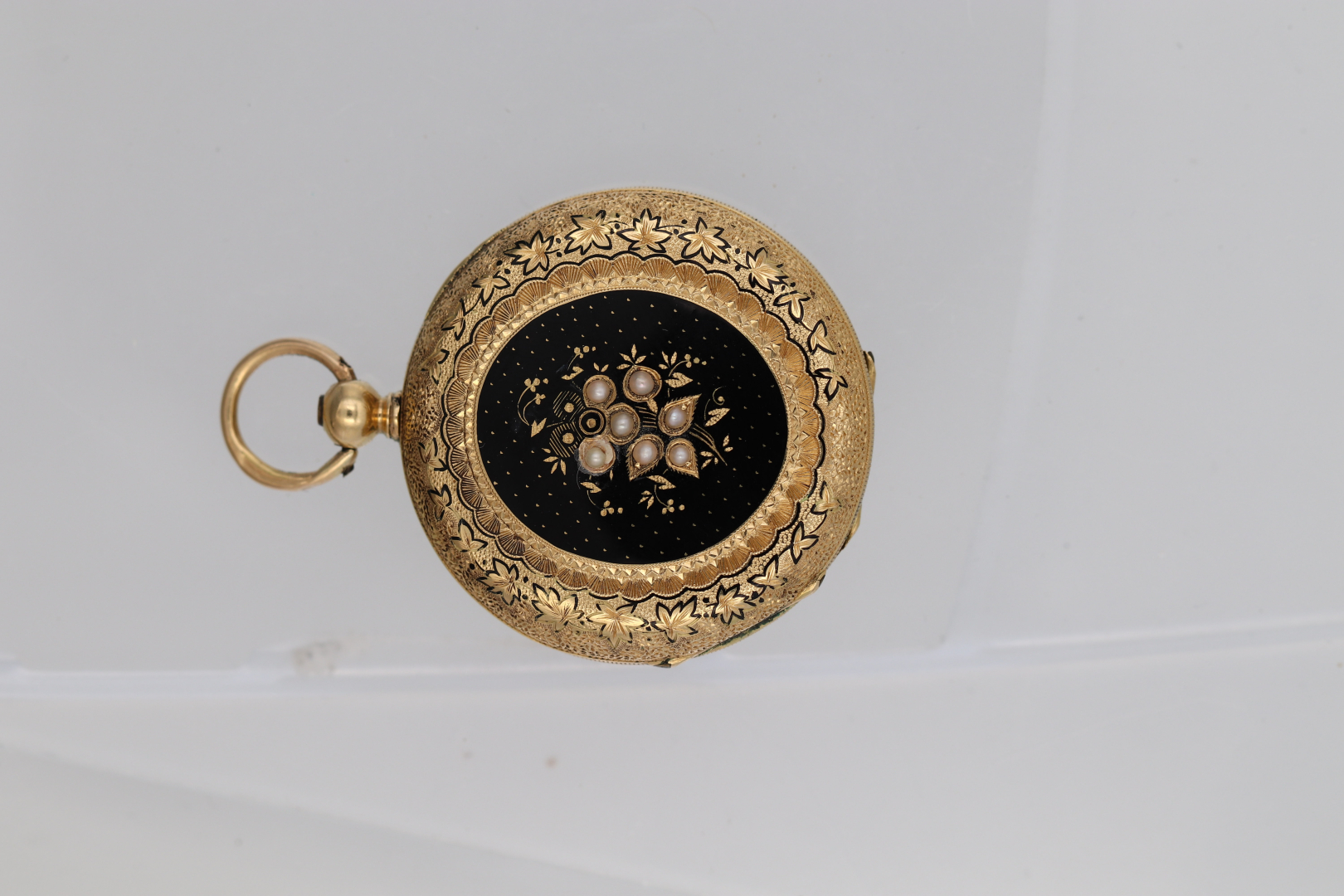 Case: n. 56590, in 18K gold, engraved with vegetal motifs, decorated with black enamel and set with seed pearls, signed cuvette.