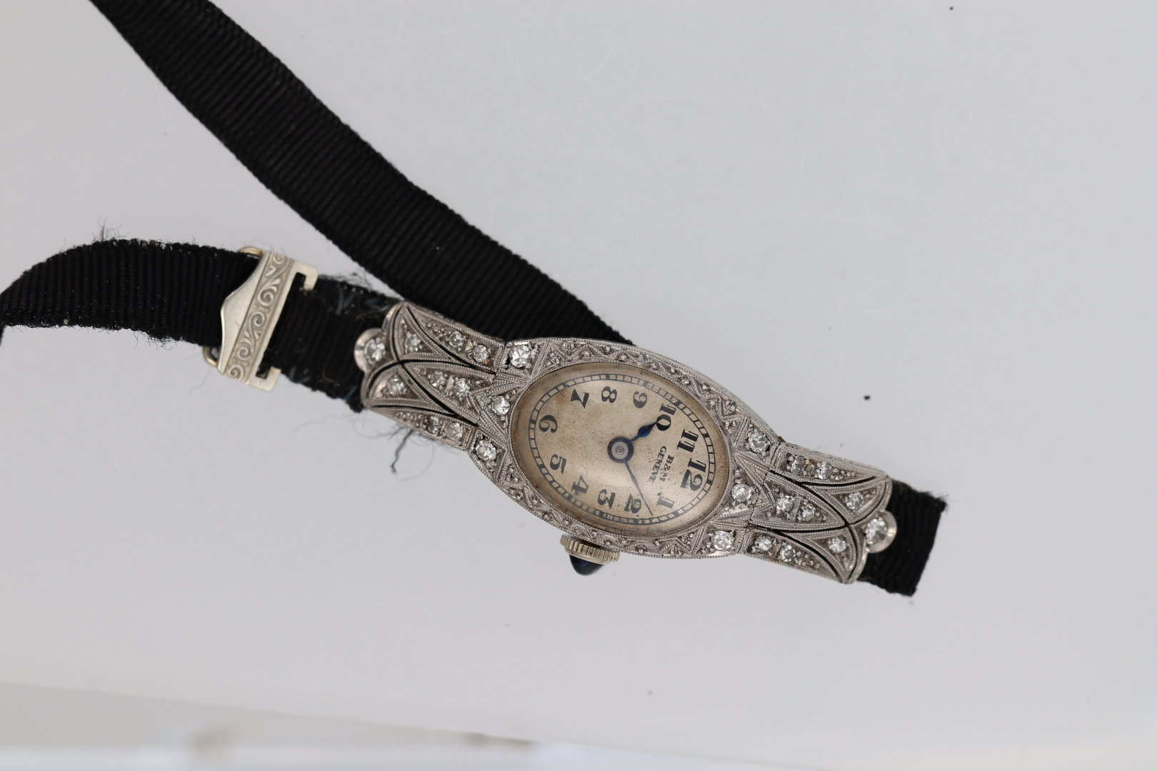 Case: n. 76254, in platinum, hinged caseback, mobile lugs, entirely engraved and set with rosettes.