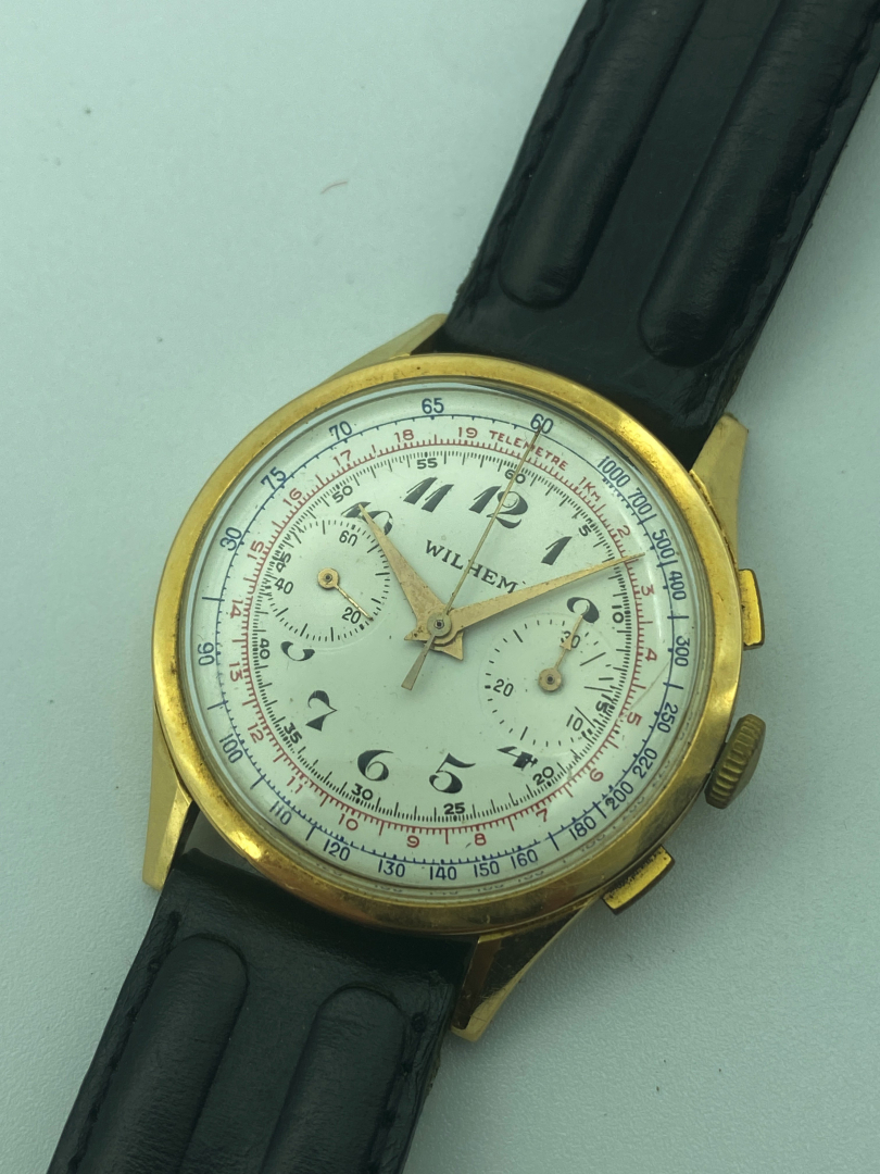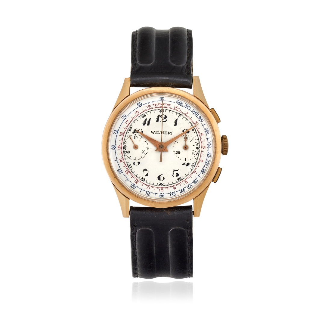 Dial: signed “Wilhem”, silvered, printed numerals, continuous seconds, 30-minute counter, tachymeter and telemeter scales.