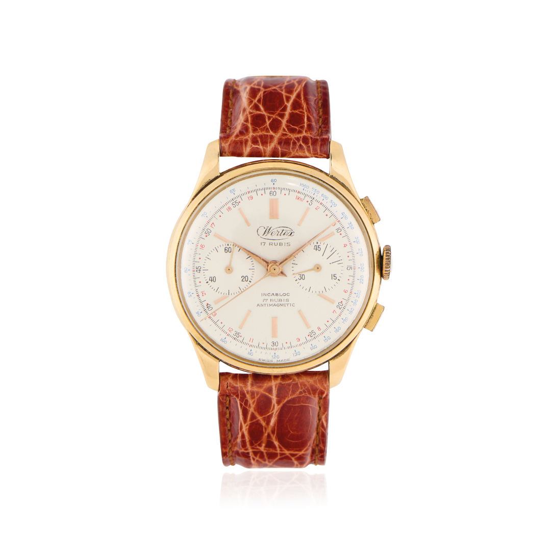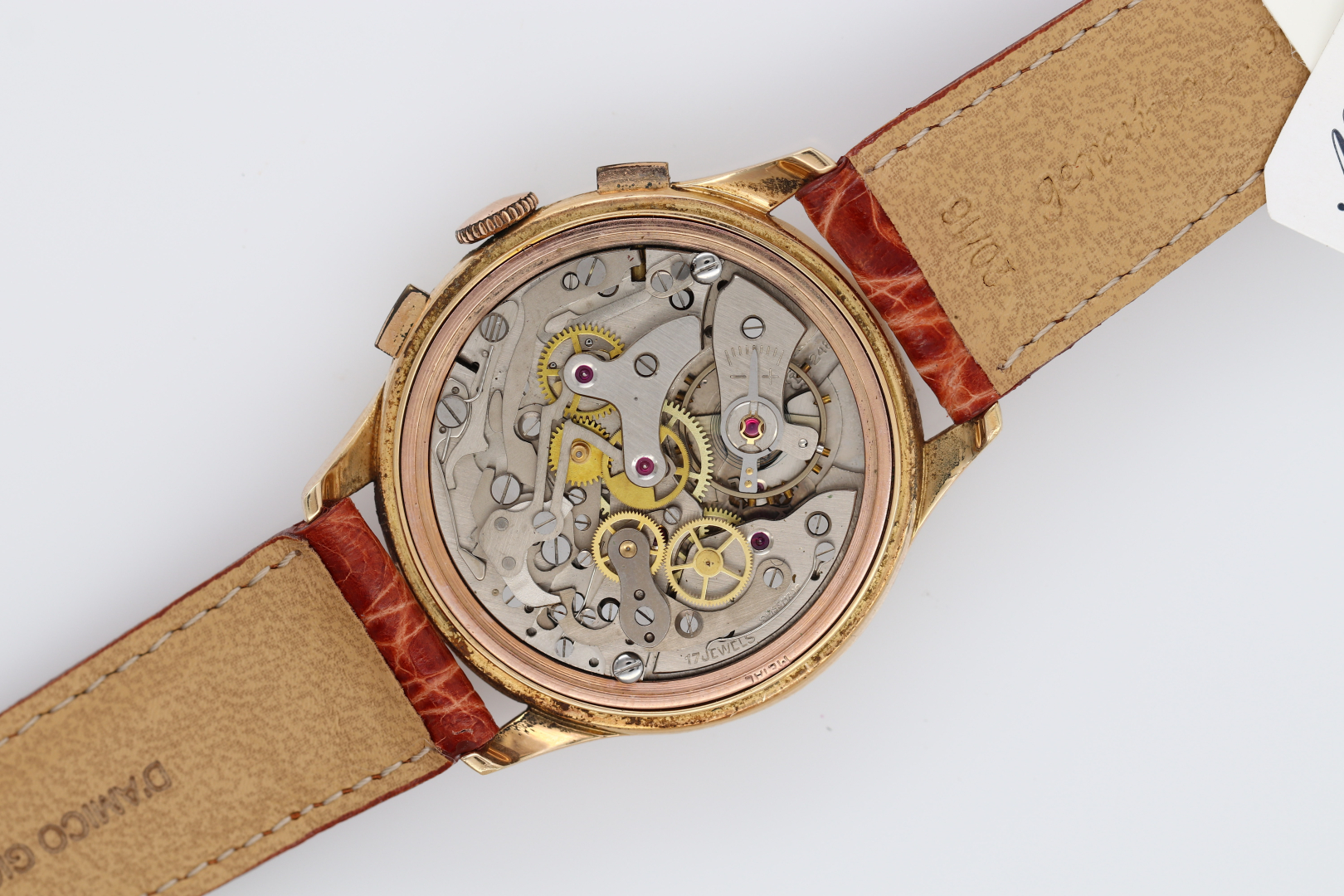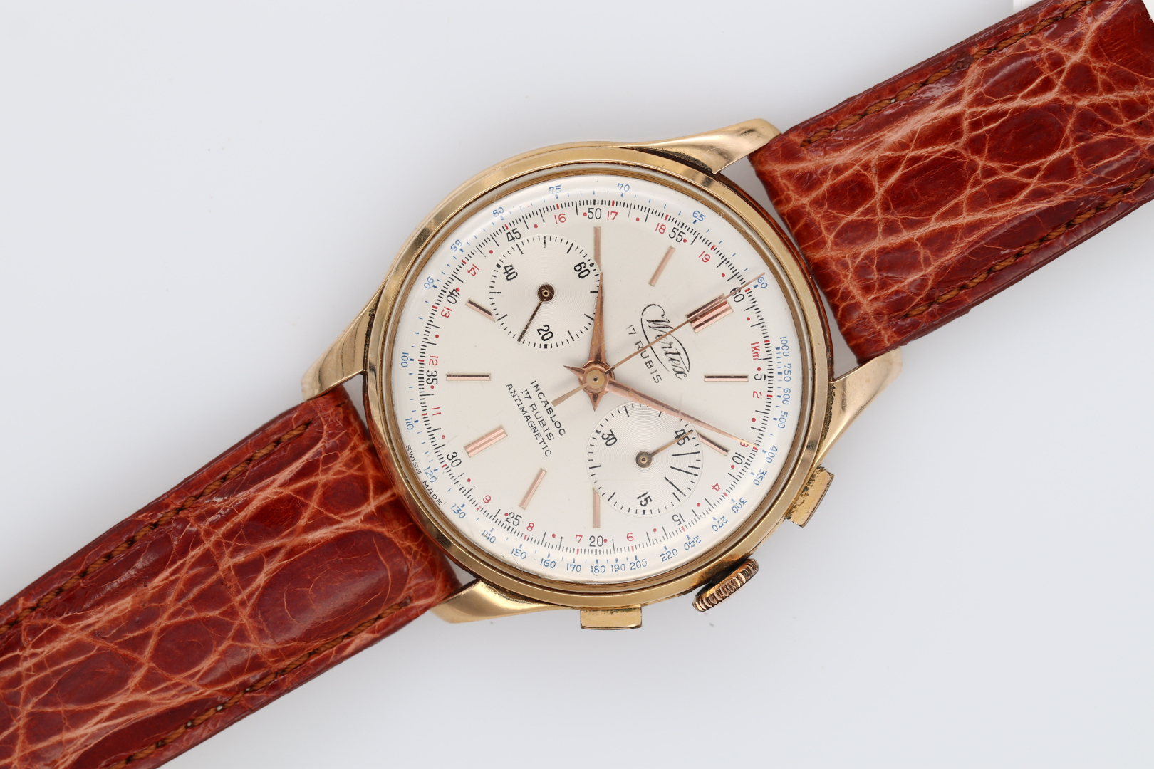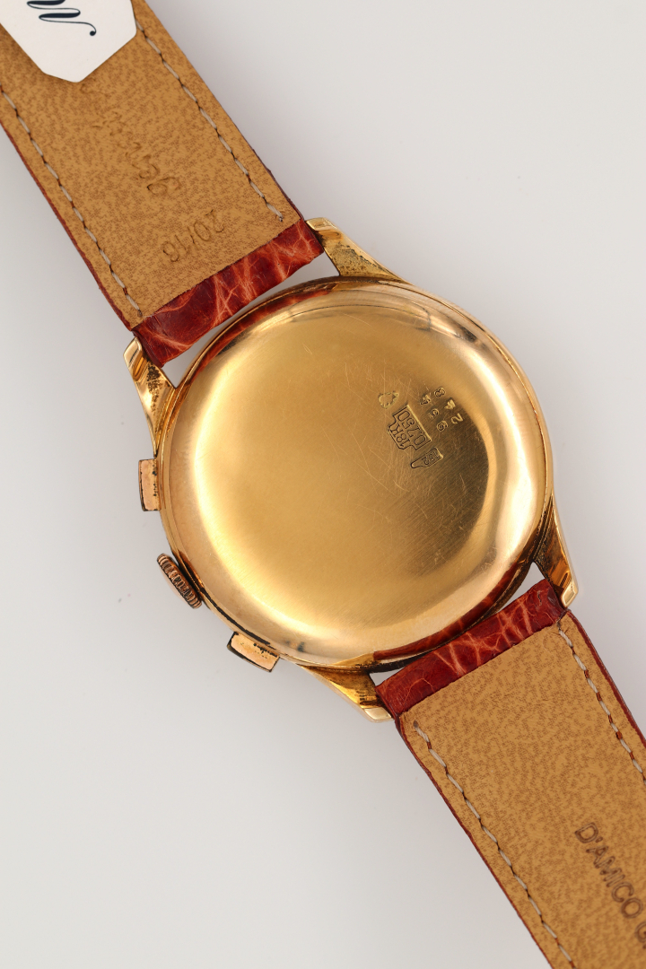 Dial: signed, silvered, applied indexes, continuous seconds, 30-minute counter, tachymeter and telemeter scales.