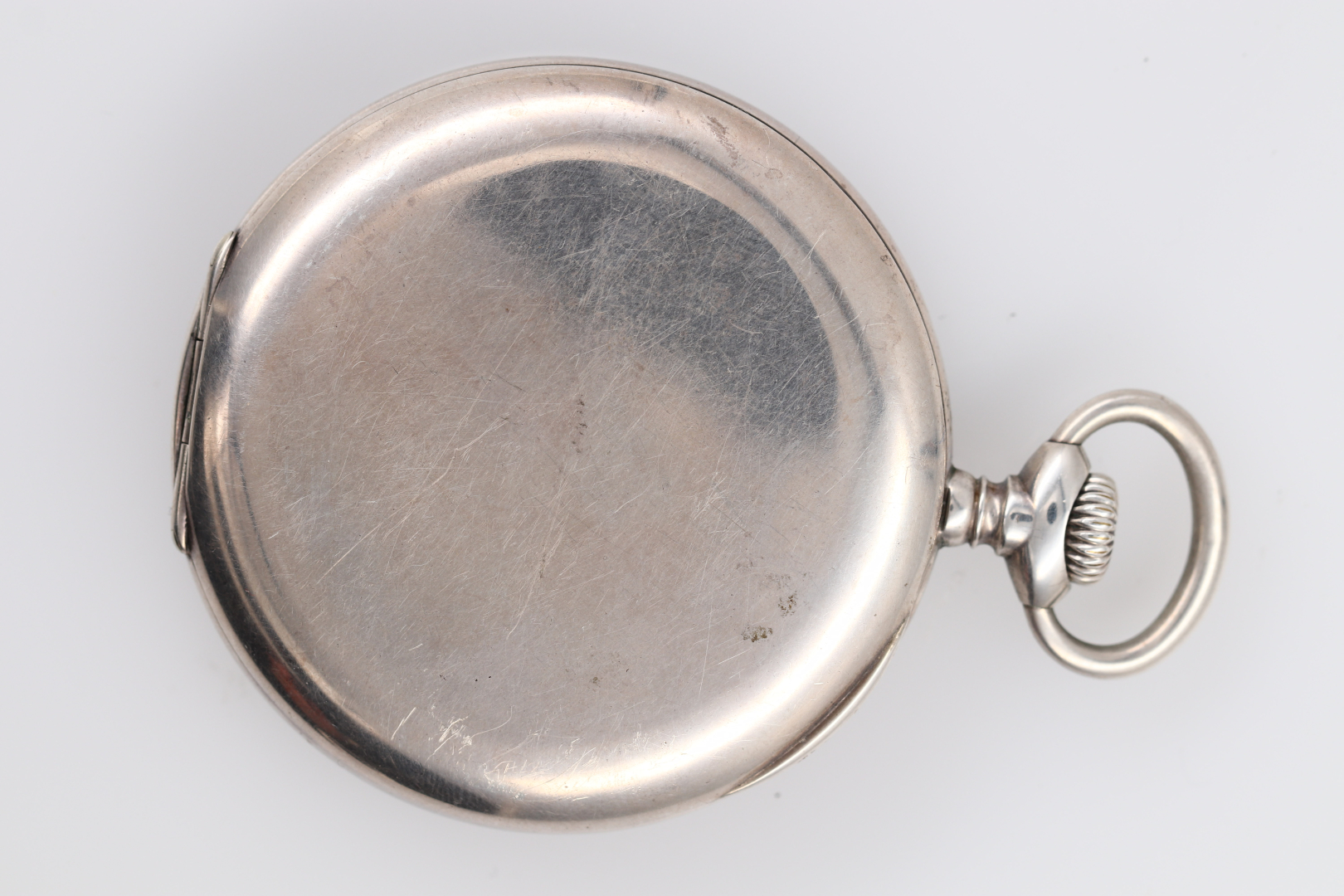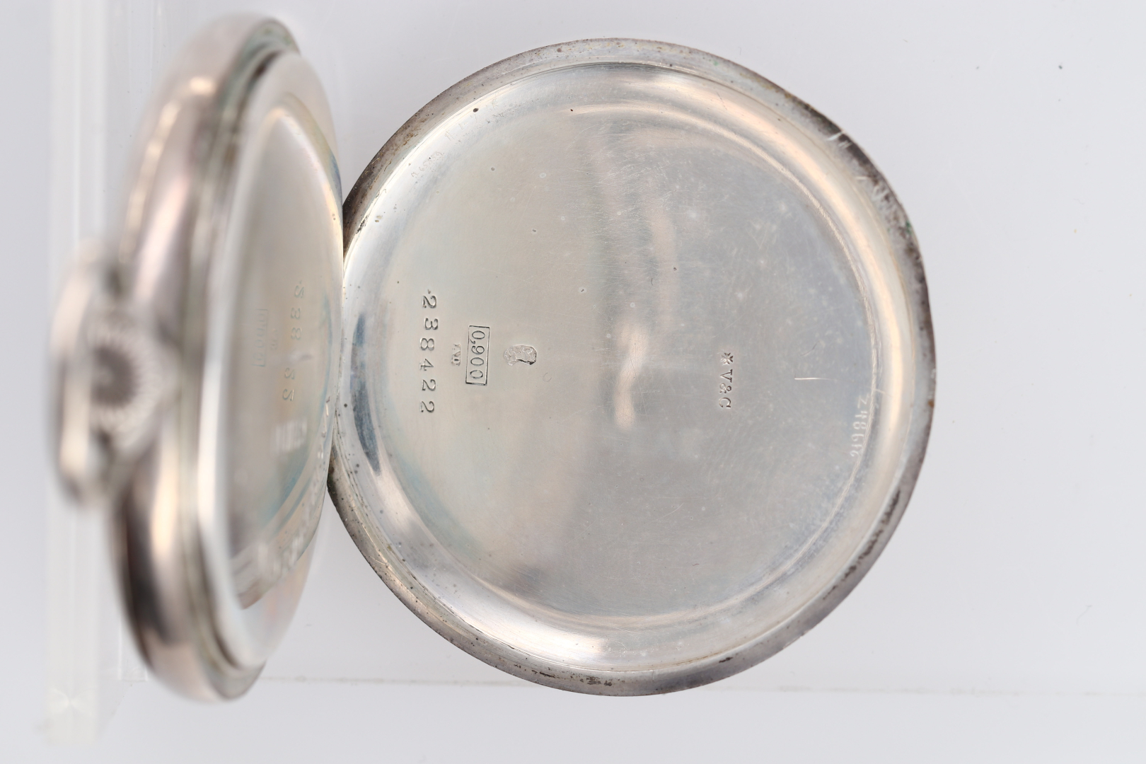 Case: signed, n. 238422, four-body 0.800 silver case, hinged back, signed cuvette. Dial: signed, white enamel, painted numerals, small seconds at 6.
