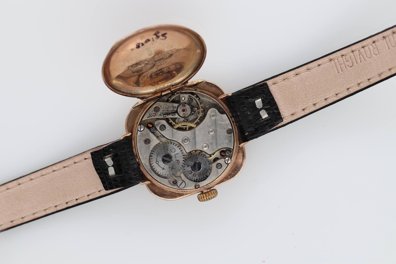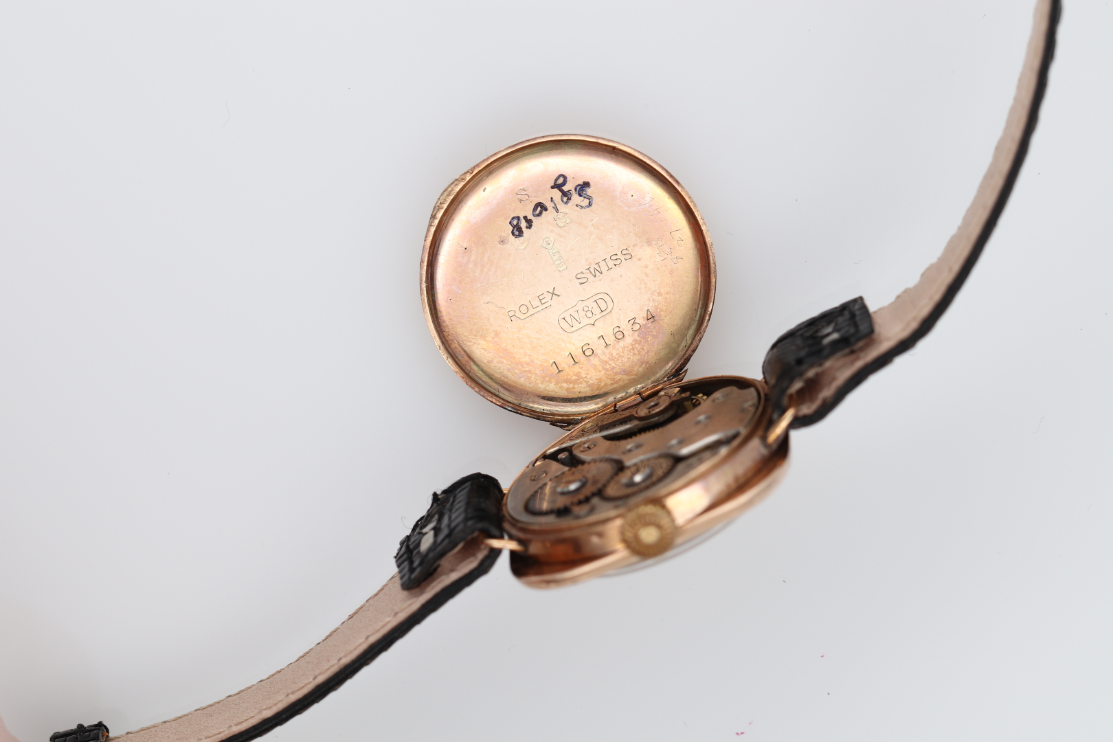 Case: signed, n. 1161634, in 9K gold with English hallmarks, hinged back and bezel.