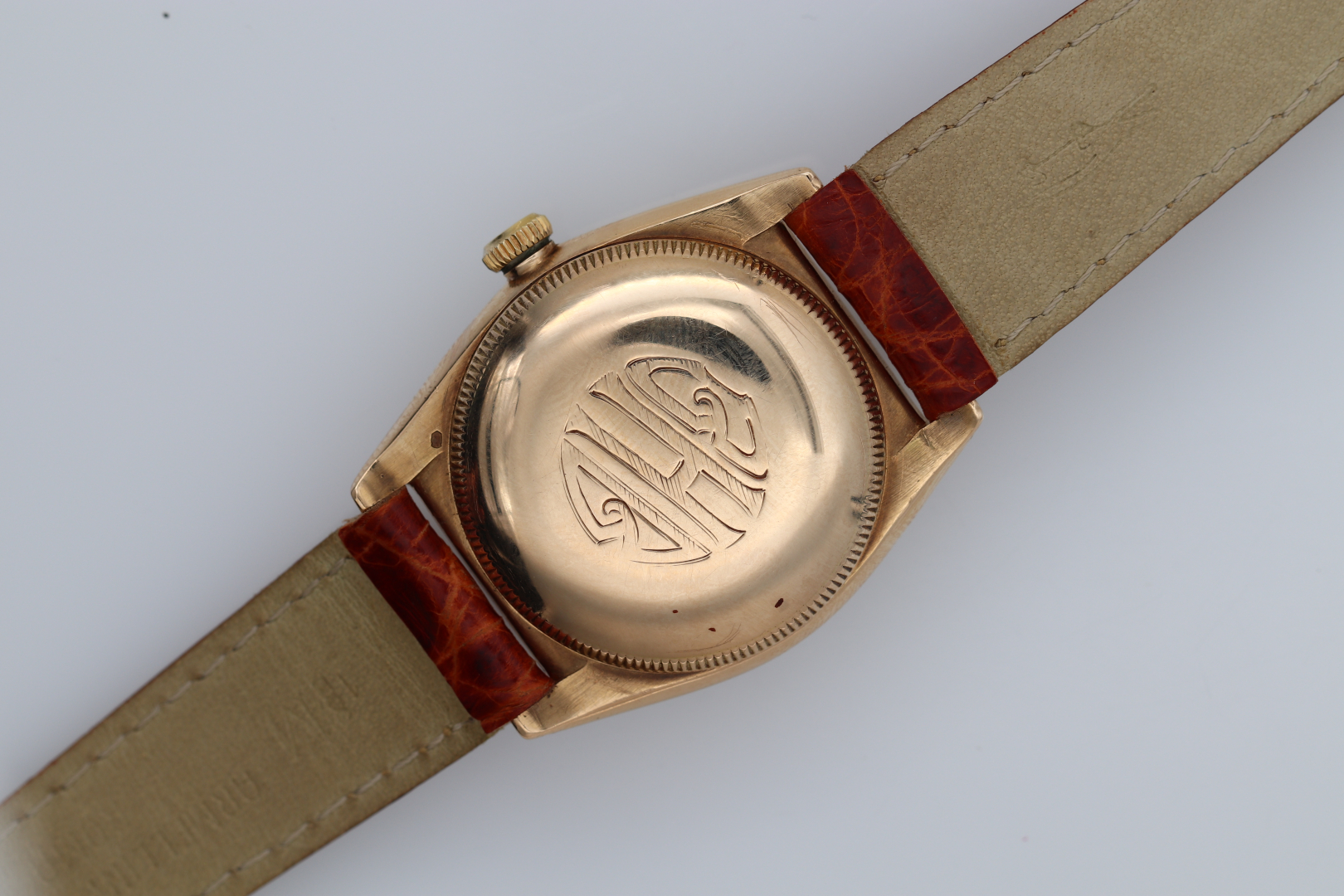Case: signed, n. 471266, in 14K pink gold, screw-down caseback with engraved monogram.