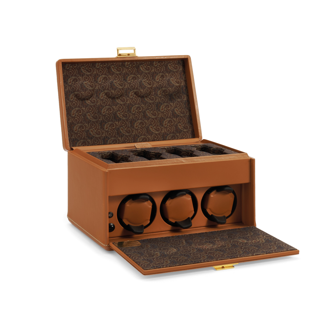 Covered in leather and lined with Paisley motif. Featuring four compartments for watches and three compartments for automatic watch winding. Made in Switzerland and assembled in Italy.
