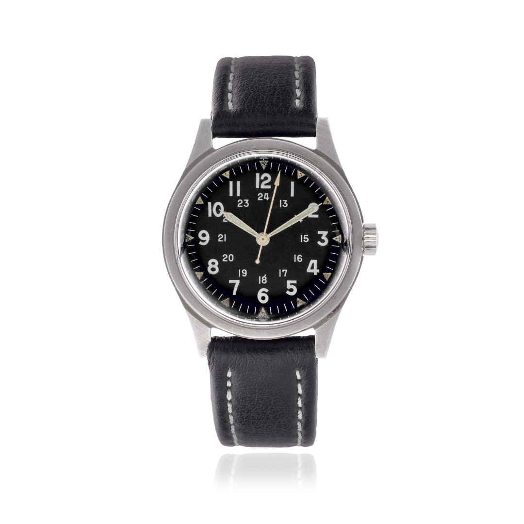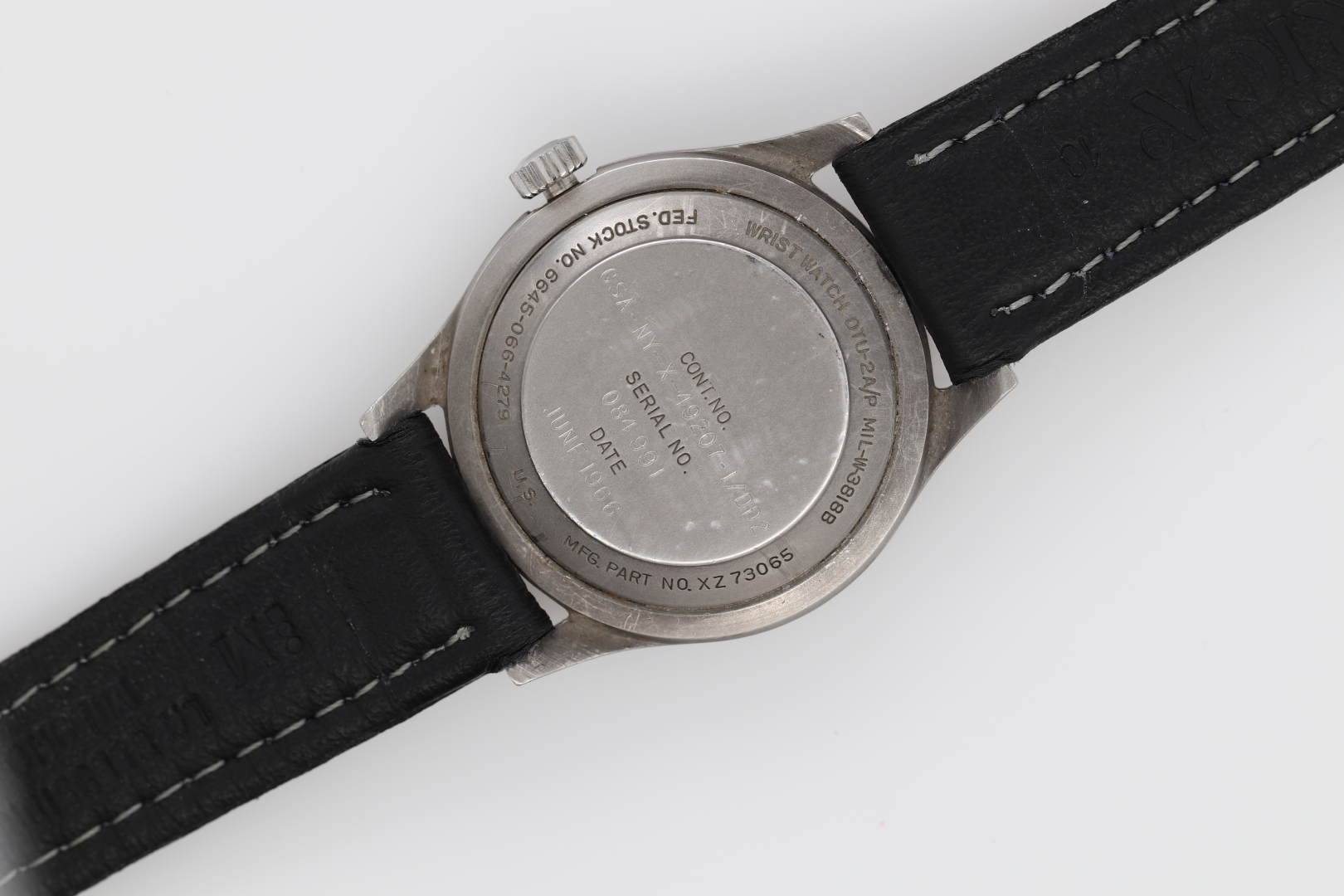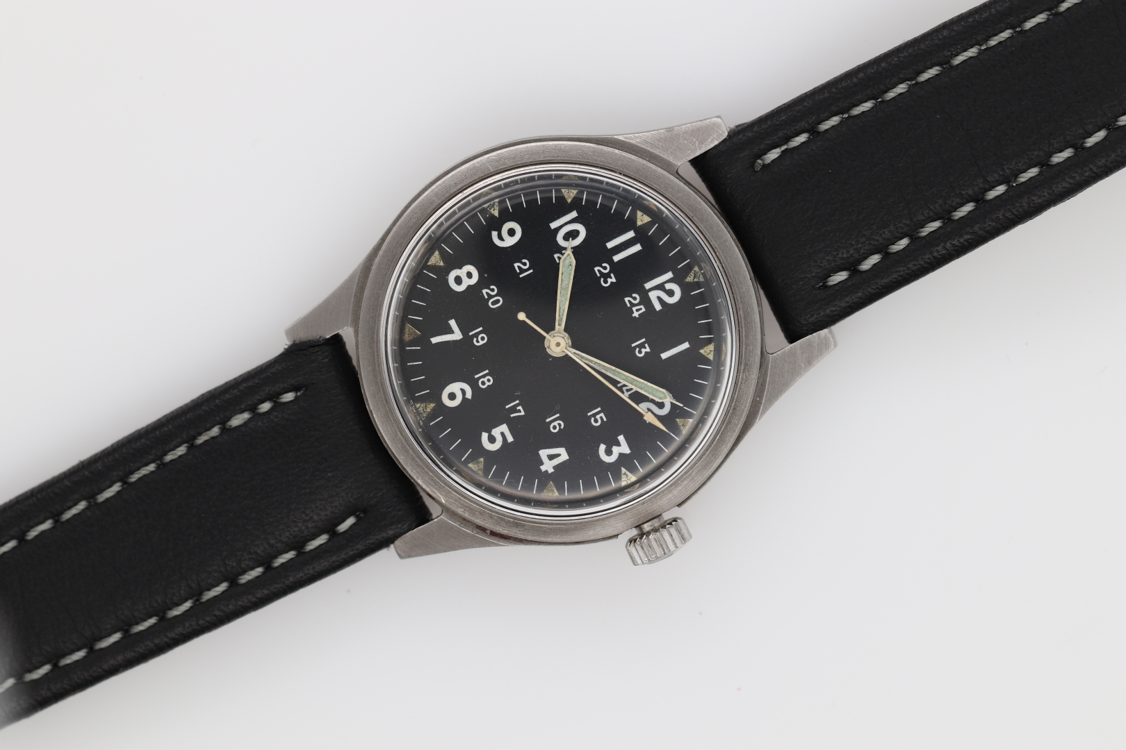 Case: n. 084991, monobloc stainless steel, satin finish, caseback engraved with military specifications.