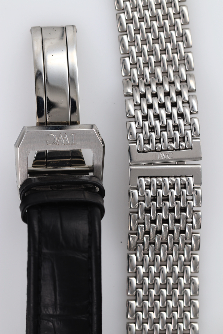Bracelet/Strap: 1) leather strap with deployant tang clasp; 2) stainless steel bracelet with hidden deployant clasp.