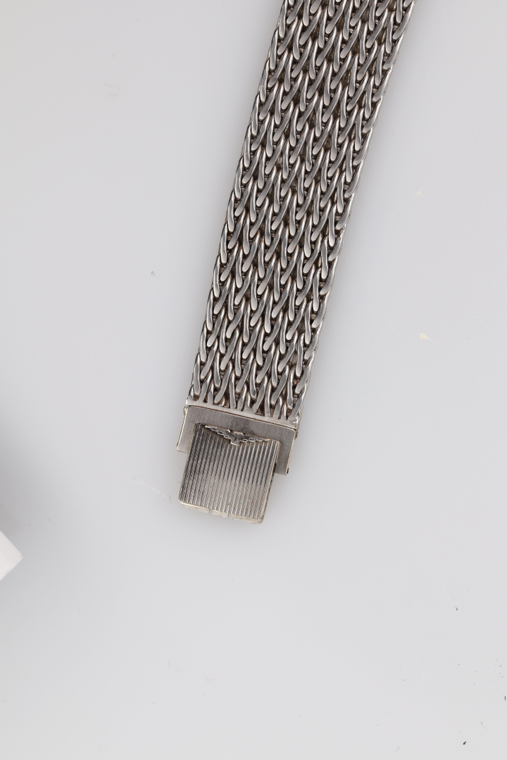 Bracelet/Strap: integrated woven-link bracelet, signed, with Italian hallmarks.