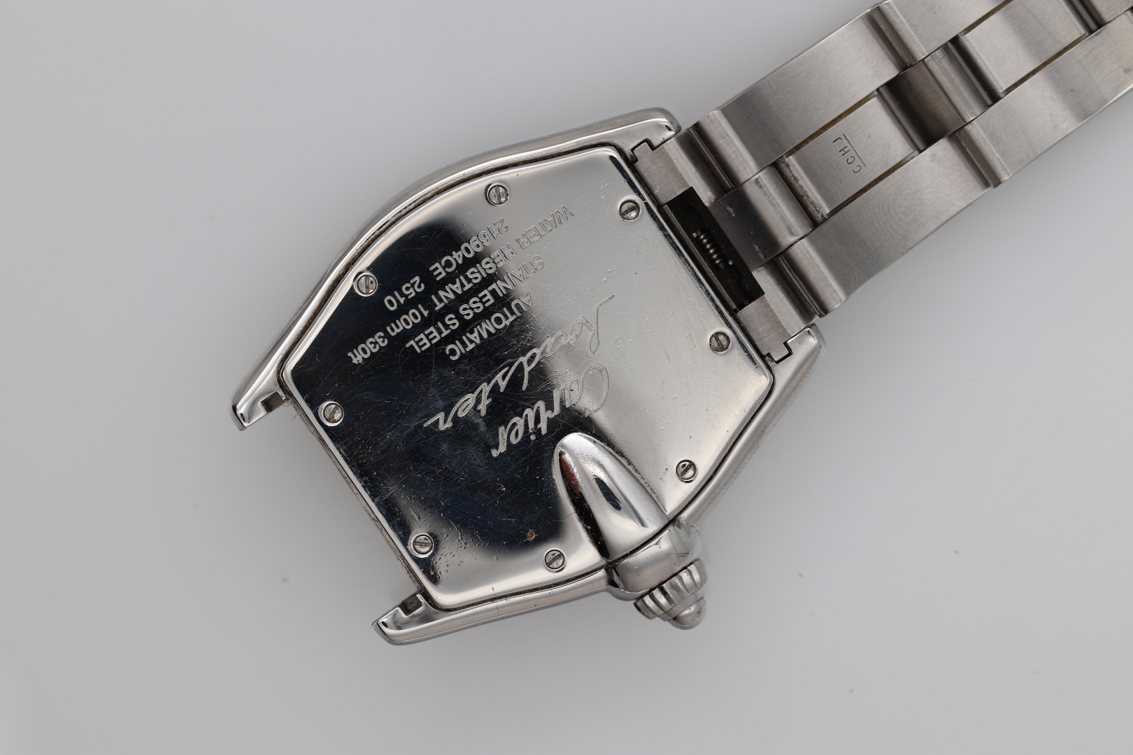Case: signed, n. 216904CE, stainless steel, caseback with screws.
