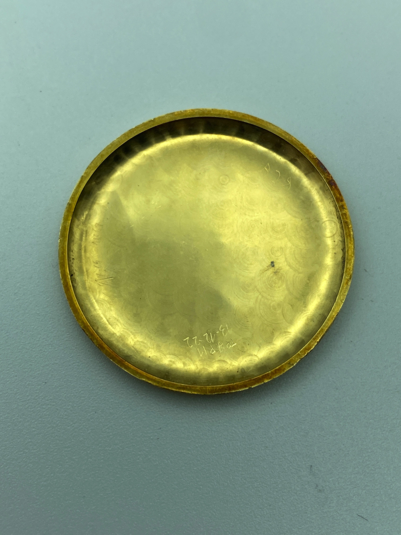 Case: signed, n. 1602 109, in 18K gold, snap on caseback, sliding pusher for chronograph stop function.