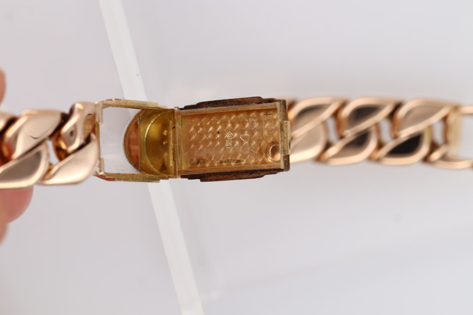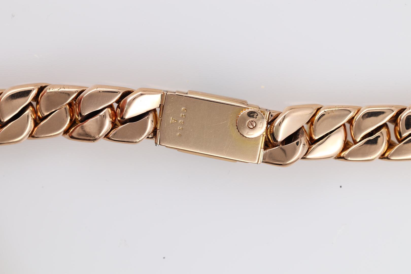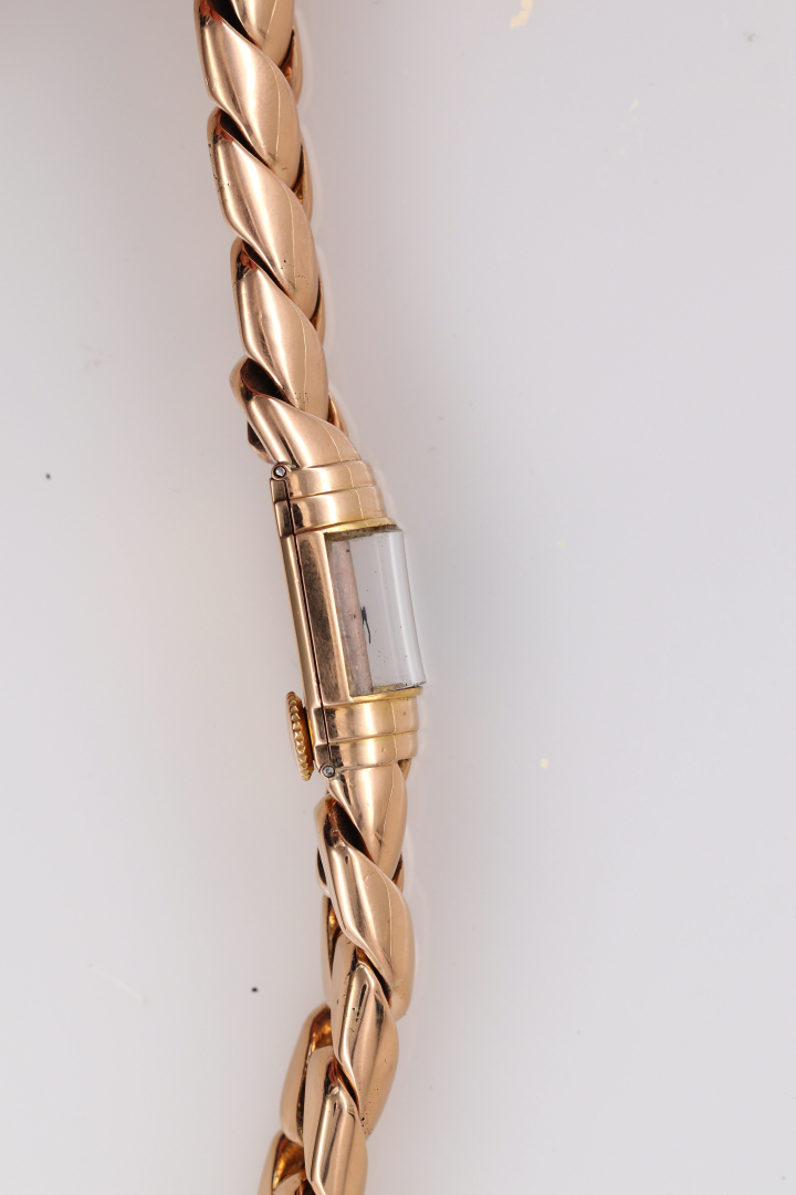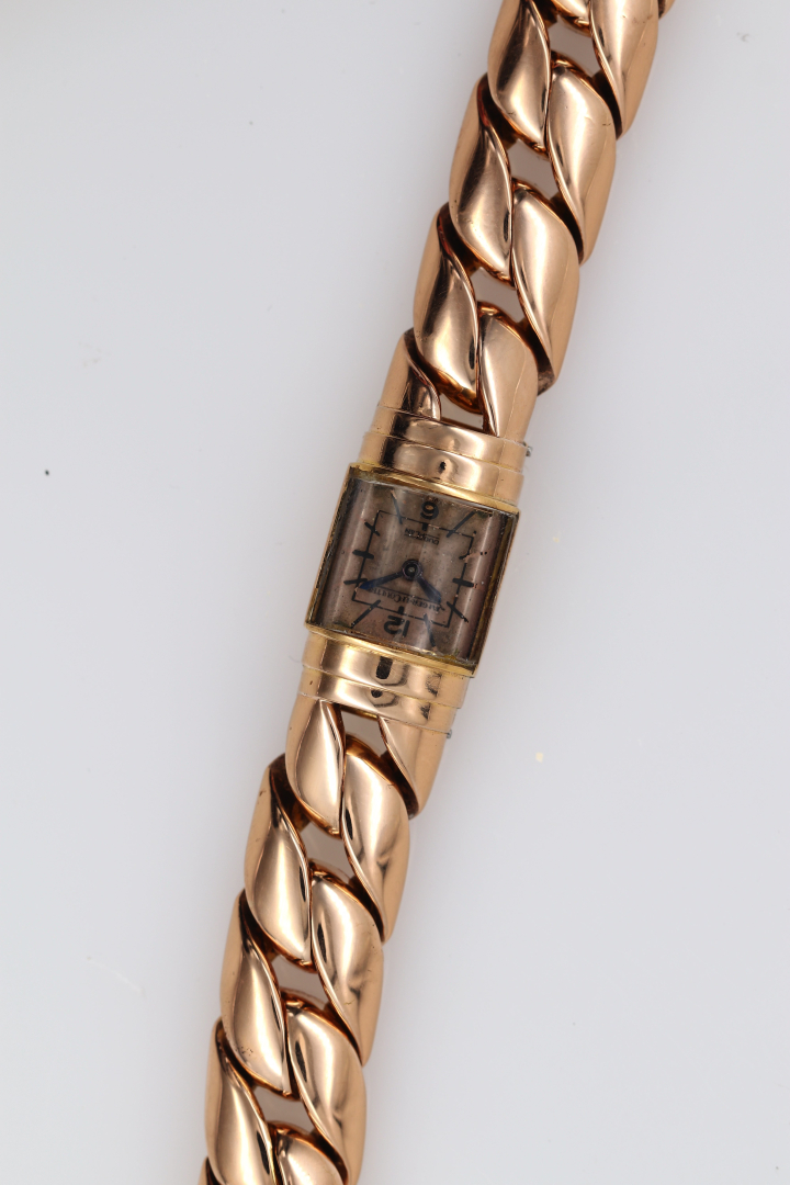 Case: signed LC, n. 62814 A, in 18K pink gold, hinged caseback, crown on the back, cylindrical case and crystal. Dial: signed, salmon, printed numerals. Movement: signed, manual-winding caliber 403, n. 111710. Bracelet/Strap: integrated chain-link bracelet, in 18K pink gold. Accessories: outer box, box, Extract from the Archives (manufactured in 1940). Diameter: 13 mm | Weight: 65 g | Bracelet length: 15.5 cm. Note: running at the time of cataloguing.