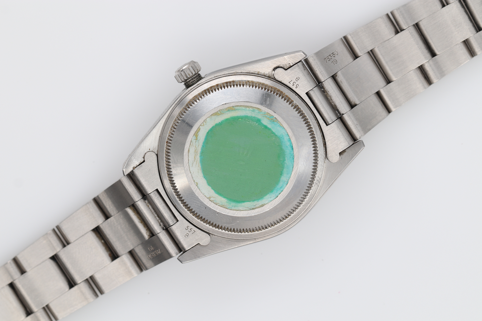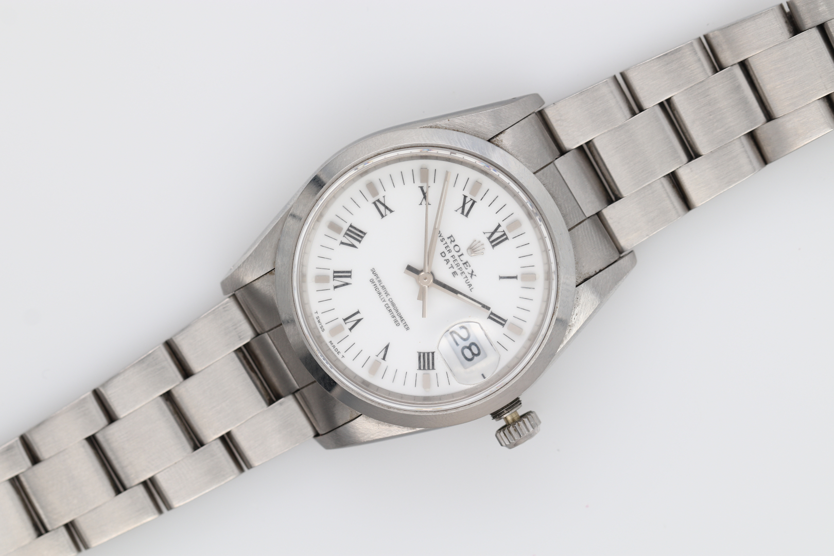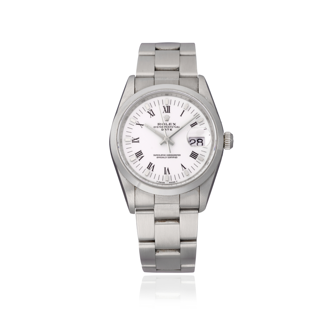 Case: signed, n. N215923, in stainless steel, screw-down caseback ref. 15200. Dial: signed, white enamel-style, applied indexes and printed Roman numerals, centre seconds, date. Movement: signed, automatic caliber 3135, n. 623954, adjusted to temperature and five positions. Bracelet/Strap: signed, stainless steel, Oyster ref. 78350, end-links 557B, deployant clasp P12. Accessories: outer box, box ref. 68.00.2. Diameter: 34 mm | Bracelet length: 17 cm (11 links) Note: running at the time of cataloguing.