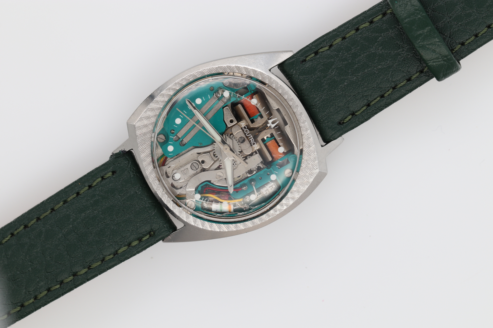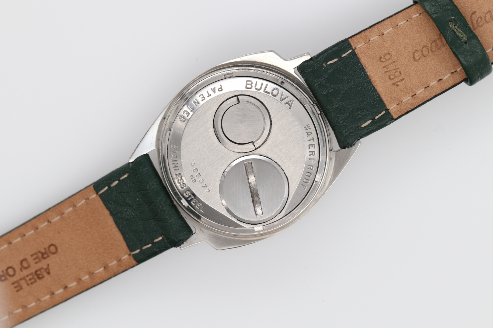 Case: signed, n. A55077 M6, asymmetrical stainless steel case, screw ring back, guilloché finish.