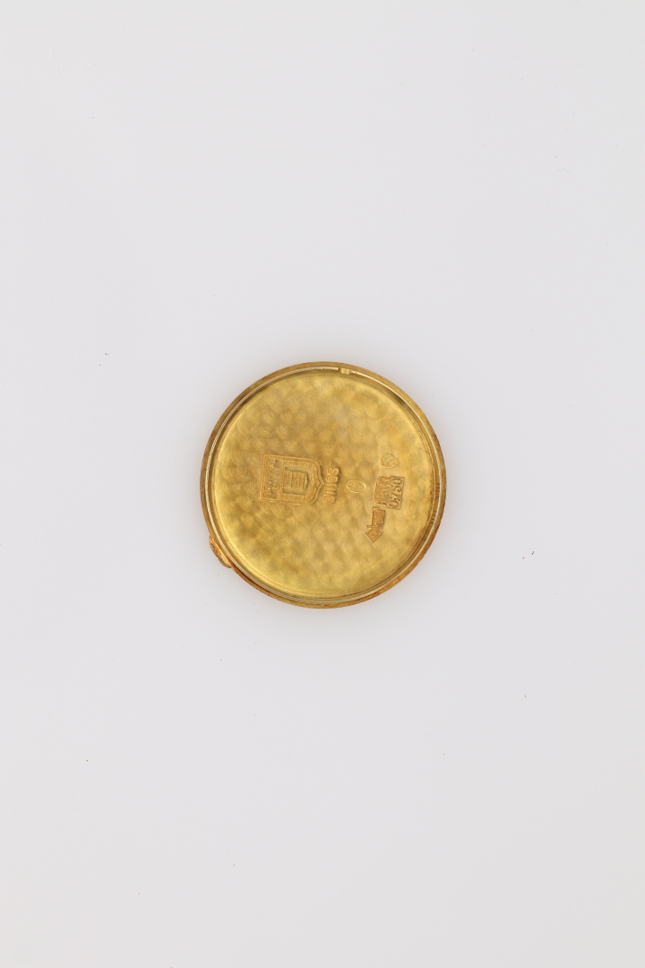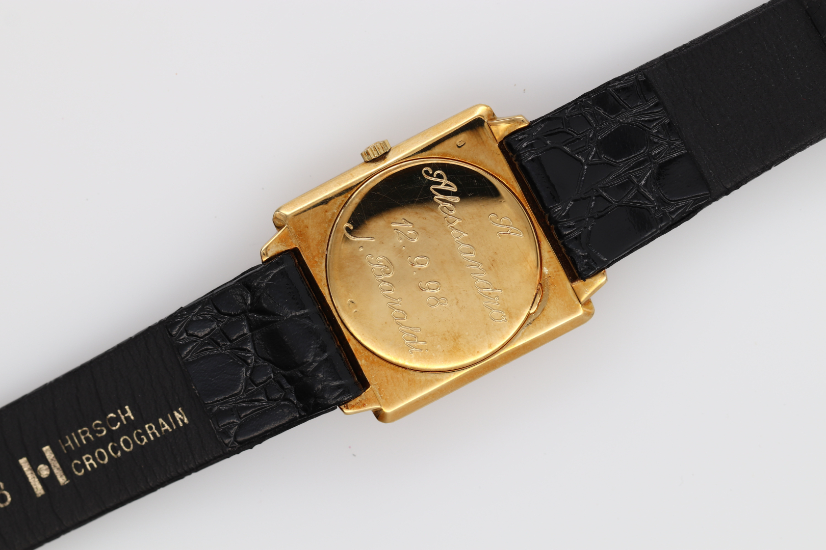 Case: signed, n. 2208223, in 18K gold, engraved dedication on caseback, sunburst finish, smooth bezel.