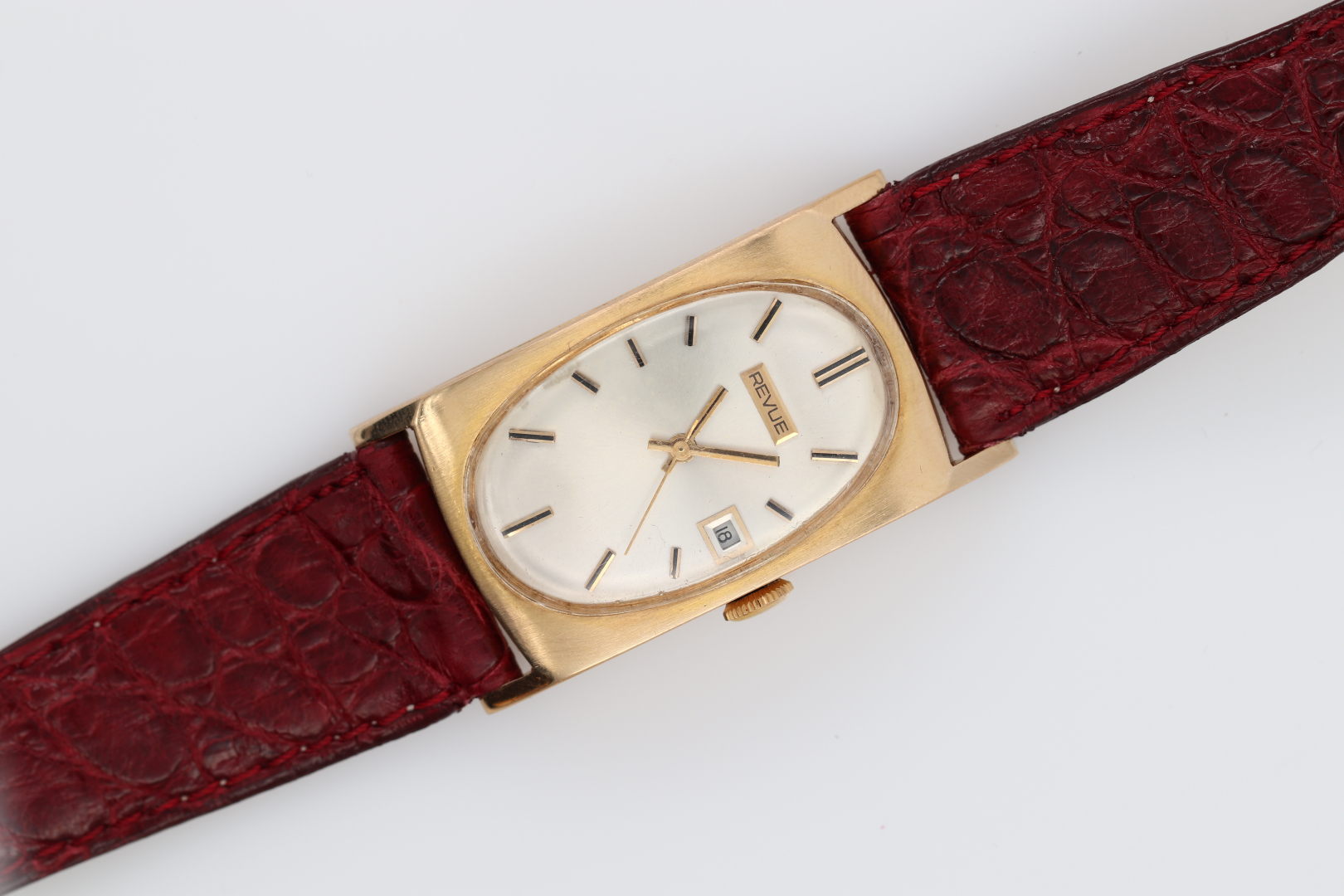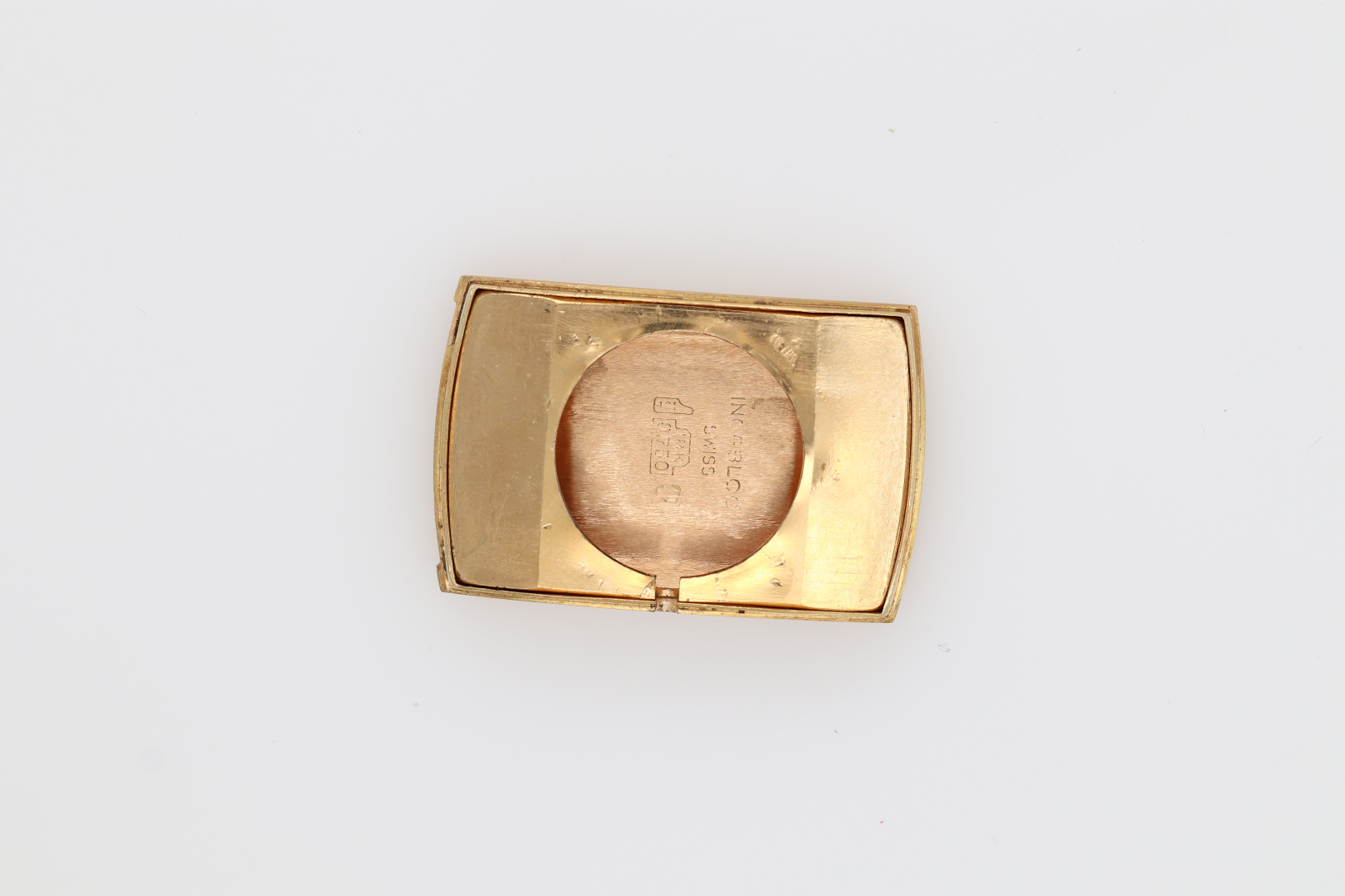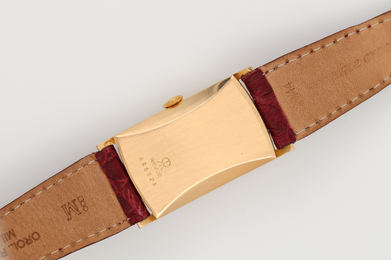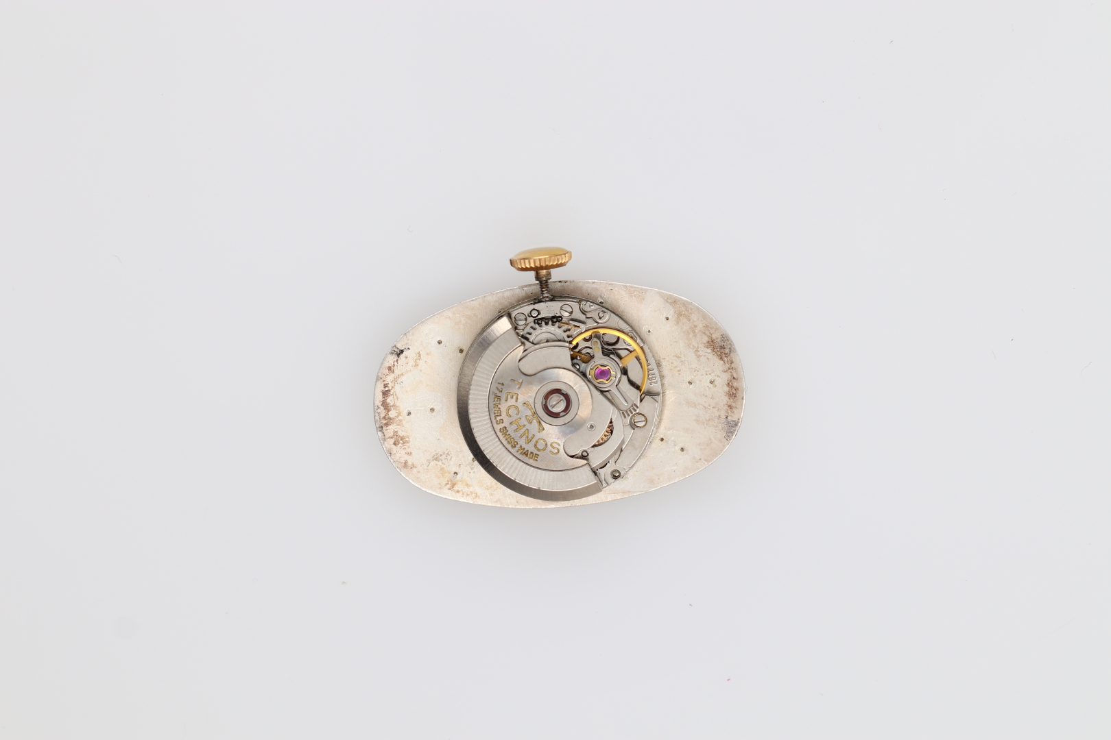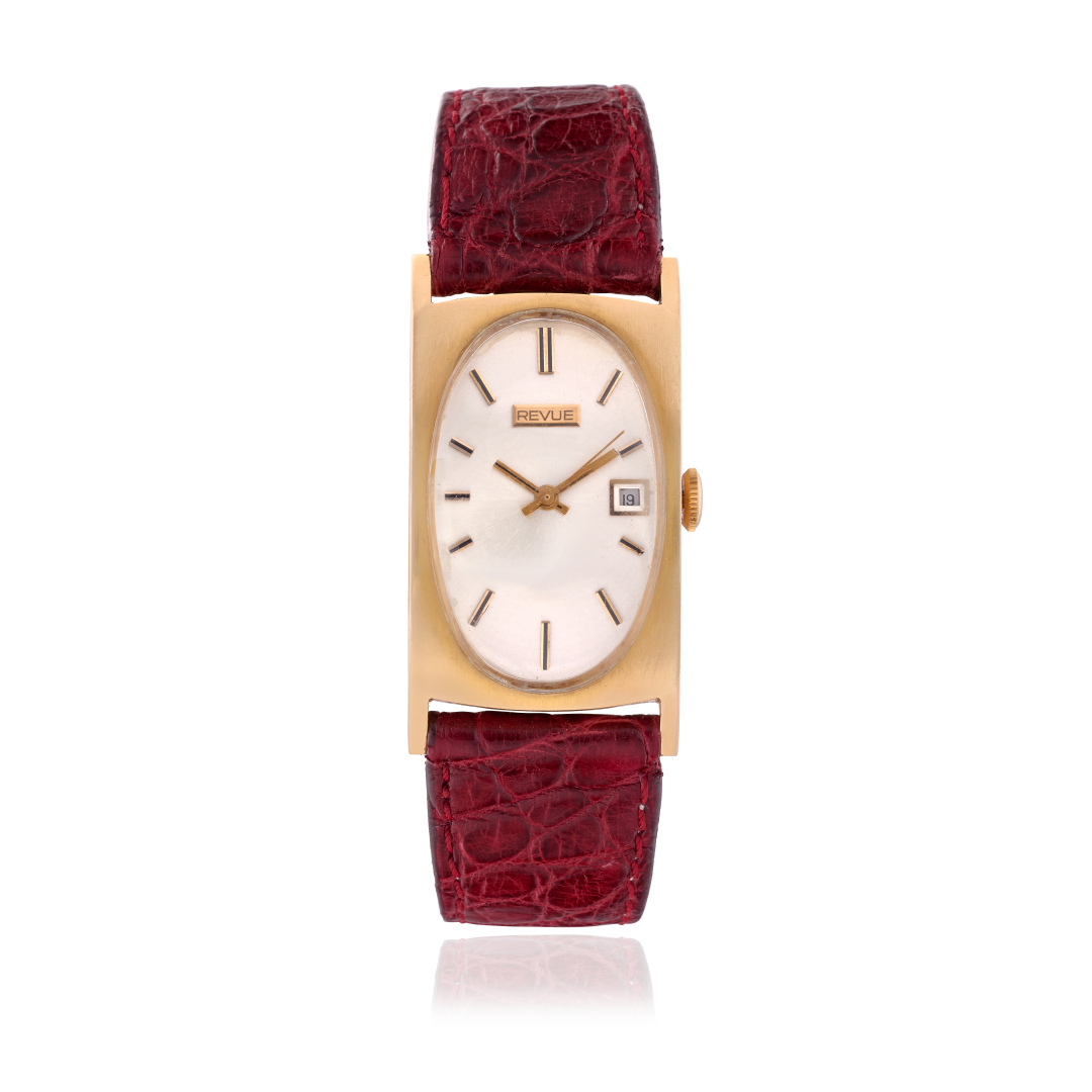 Case: signed, n. H4682A, in 18K gold, snap-on caseback, curved caseband. Dial: signed, silvered, applied indexes, centre seconds, date. Movement: signed Technos, automatic caliber 2671. Bracelet/Strap: – Accessories: – Dimensions: 34 x 22 mm Note: running at the time of cataloguing.