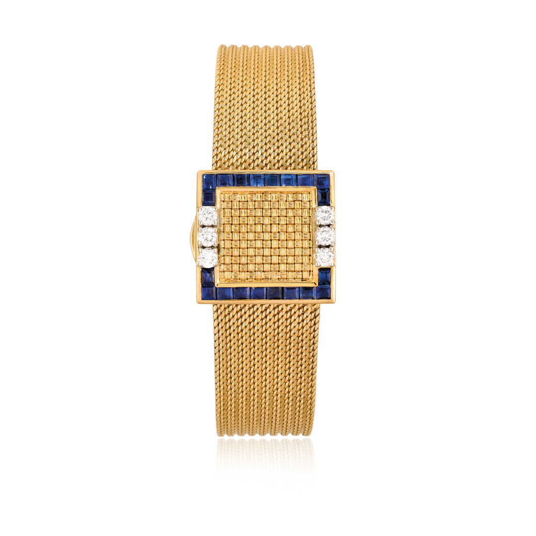 Case: signed, n. 204012, in 18K gold, cover sets with diamonds and sapphires, snap on guilloché-finished caseback, crown on the back.