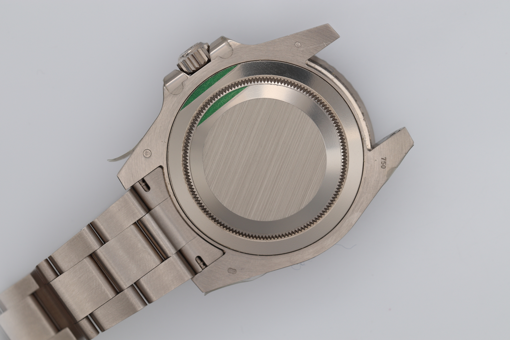 Case: signed, n. 4X449112, 18K white gold, screwed caseback 2349, Cerachrom blue and red graduated bezel.