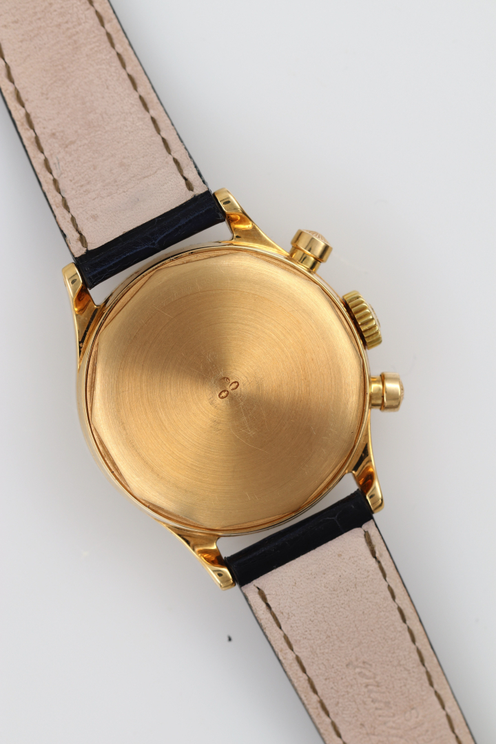 Dial: signed, silvered, "Suisse" writing under 6, applied indexes, continuous seconds, 30-minute counter, tachymeter scale.